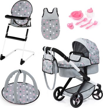 BAYER DESIGN DOLLS: XEO 11 PIECE SET - GREY, PINK, STARS - This big doll s pram set consists of a doll s pram, a high chair, a sleeping bag, a play gym and plastic accessories. The combi doll’s pram XEO has a modern design and is suitable for dolls up to 46 cm / 18 inch. With its adjustable handle, this doll s pram is easily adaptable to your child s height; also, it s possible to attach the carrycot in direction of travel or towards your child. With the reversible handle a change of the direction is also possible. The doll’s pram can be easily converted to a pushchair with press buttons and with the change of the angle of the carrycot. The swivel front wheels assure a stable cornering. The accompanying bag fits perfect to the color combination of the doll’s pram. The doll s pram set also includes a sleeping bag to put the dolls and stuffies to sleep. In the doll s highchair with integrated tray, the baby doll can be fed comfortably thanks to the bottle and harness. A pacifier and a play gym are also included for comforting and playing. INCLUDES: 1 Dolls Pram, 1 Shoulder Bag, 1 Playing Arc, 1 High Chair, 1 Sleeping Bag, 1 Pacifier, 1 Bottle, 1 Plate, 1 Spoon, 1 Fork, 1 Knife. Designed for dolls up 18" (46cm) * Doll not included. Suitable for boys and girls ages 3 and up.
