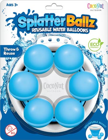 SPLATTERBALLZ REUSABLE WATER BALLOONS - 6PK OF BLUE REUSABLE MAGNETIC WATER BALLOONS FOR KIDS, PERFECT FOR SUMMER PARTIES, OUTDOOR GAMES, AGES 5+. Ready, Set, Splash! Let the water balloon games begin! Introducing the game changing SplatterBallz Reusable Magnetic Water Balloons from CocoNut Outdoor: the ultimate summer fun essential without the waste! Our innovative balloon design is made from a durable yet soft silicone that allows for easy refill, rapid self-sealing with magnetic technology, and hours of endless amusement. No more need for wasteful one-time use latex balloons; switch to our eco-friendly reusable water balloons and elevate your water fights! Perfect for any outdoor summertime event at the pool, beach, or simply running around the backyard, SplatterBallz are guaranteed to create a huge splash this summer again and again! Each Battle Kit includes 6 reusable magnetic water balloons in vibrant colors, and a matching collapsible bucket to fill your balloons. Ages 5+ Salus Brands is the proud brand owner of CocoNut Outdoor and SplatterBallz. We are dedicated to creating fun, imaginative, and creative toys. We study the latest trends and bring you the best, most unique toys on the market. Our products have been featured on radio and new stations across the country, countless blogs, and even The View! We strive to provide quality products and superior customer service, while continuously innovating with new, distinctive designs.