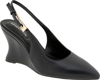 A pointy toe elongates the profile of a streamlined slingback pump featuring a cushioned footbed and sculptural wedge heel for walkable comfort.