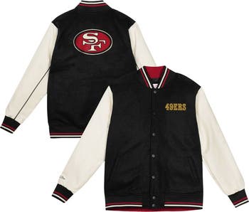 Elevate your favorite young San Francisco 49ers fan s wardrobe with this Mitchell Ness Full-Snap Varsity Jacket. This premium jacket features faux leather sleeves and an embroidered team logo patch at the left chest, showcasing their San Francisco 49ers pride in style. The midweight design is perfect for moderate temperatures, while the striped rib-knit collar, cuffs and hem provide a snug and comfortable fit for young fans.