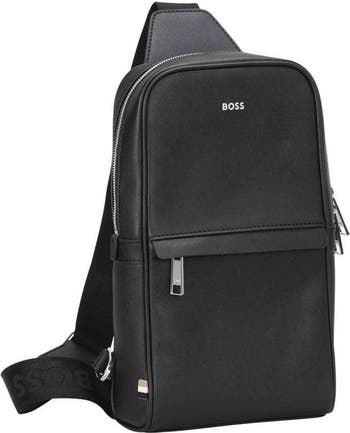 Bonded leather featuring a crosshatched finish emphasizes the impeccable craftsmanship of this versatile sling bag suspended from an adjustable webbing strap for easy wear.