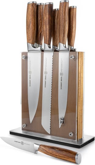 - Acacia Midtown Universal Knife Block (9"W x 3.5"D x 9.5"H) Technical Details: Blade Hardness: 59 +/- HRC