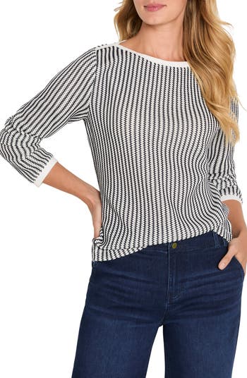 The zigzag pattern brings visual appeal and texture to this top that drapes to a hip length with an easy fit that perfectly complements your casual-chic weekend look.