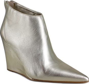 A rich leather upper and streamlined silhouette lend luxe appeal to a striking bootie framed by a pointy toe and wrapped wedge heel.