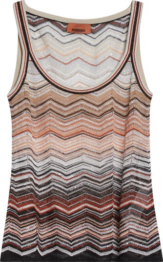 The classic Missoni zigzag knit is rendered in earthy hues and highlighted by sparkling metallic fibers for a stunning—yet so simple—scoop-neck tank.