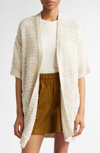Elevate any casual look with this open-front cardigan knit in a dropped-shoulder relaxed silhouette from cotton-blend bouclé yarns flecked with metallic shimmer.
