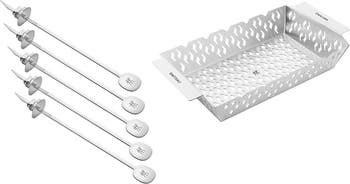 Easy-to-move sliders secure food in place on these skewers for an even grill and perfect finish. The flat skewers ensure food doesn t spin and the basket makes transporting your creations to the table a breeze.