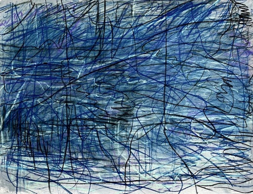 In this contemporary drawing in pastel, graphite and acrylic on paper, layered undulating lines in blue, black and pale mint blue investigate the properties of abstract curvilinear forms found in the localized conditions of Margaret Neill's surrounding environment. This experience is sublimated in a process both primal and analytical in developed drawings that are composed of deeply layered intersecting geometries and invite the viewer to contemplate presence in the fluidity of time. This work has an auditory influence described through pulsing, skeins of line that reflect patterns of tension and forces of frequency. Like sound waves, diagnostic patterns or aural imagery these drawings reflect amplitude and dimension through interior as well as exterior space.