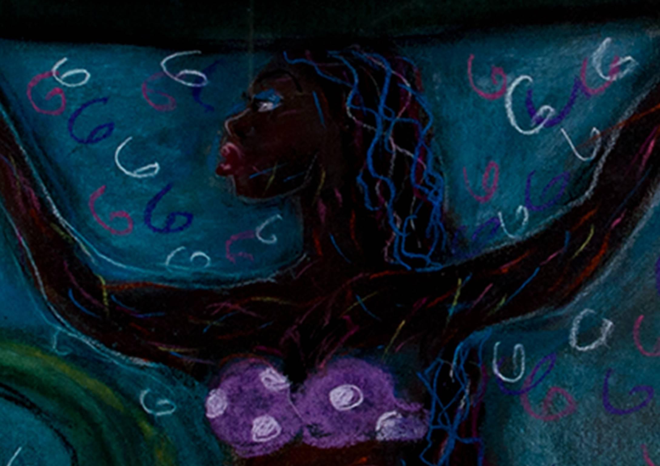 'Deep Blue With Pamela' is an original signed pastel portrait. The drawing presents a portrait, presumably of Pamela, who Reggie has rendered in greens and yellows and pinks against ...