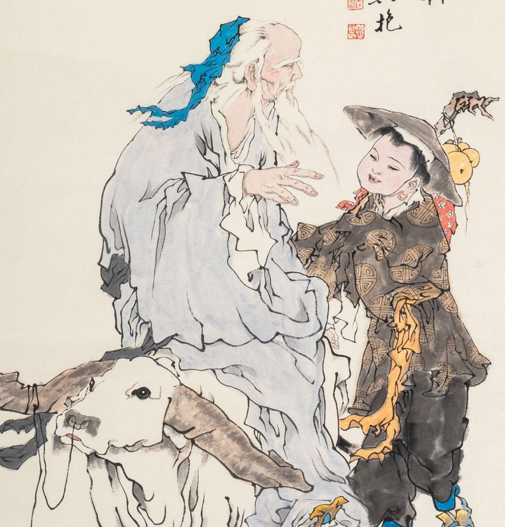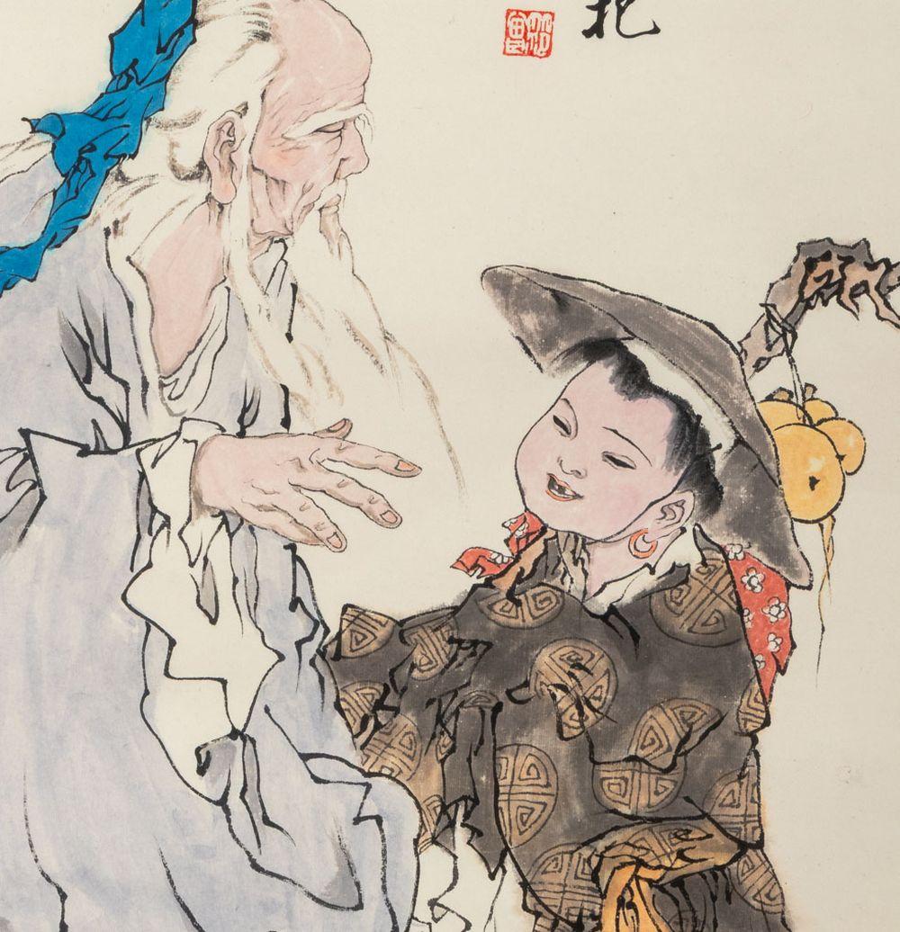 In celebration of the lunar new year festival, it was traditional all over China to hang special decorations. In a city called Wuqiang, local artists made lacquer scroll paintings laden with symbolism. This framed and finely rendered 19th century folk painting from Wuqiang features an imperial court official and his family dressed in their best silks. The young boy is dressed in a wonderfully patterned yellow robe to offer Shou Xing...