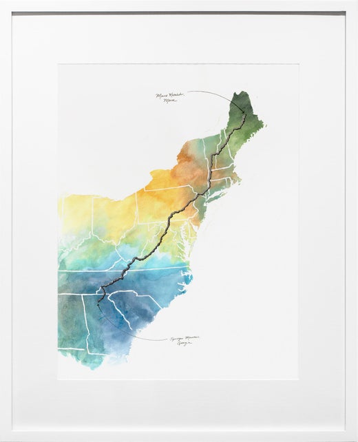 "Appalachian Trail Map" is an original pen and ink, acrylic wash artwork by Sarah Kaizar measuring 30"h x 24"w framed.