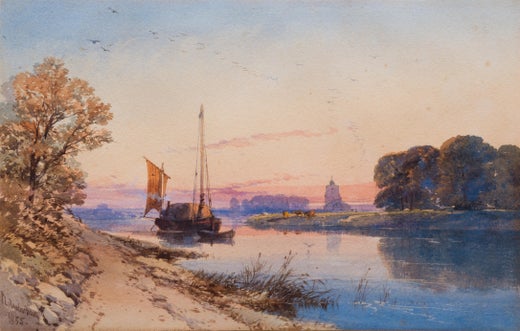Evening on the Thames, near Bray is a refined and atmospheric watercolour capturing the quiet beauty of the River Thames at dusk. The composition presents a broad, gently flowing stretch of river, its calm surface reflecting the warm glow of the setting sun. The sky is suffused with soft tones of rose, gold, and pale blue, gradually cooling as evening approaches. These colours are echoed in the water below, creating a harmonious unity between sky and river. Along the banks, trees and low vegetation are rendered with economy and sensitivity, framing the scene without disturbing its tranquil balance.