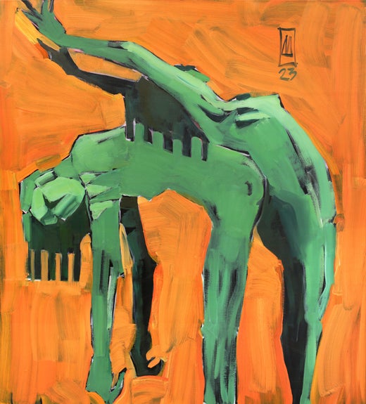 Anastasiia Danilenko is a graphic designer. But the area of her occupation is painting, and, moreover, such a traditional painting genre as a portrait. Although it cannot be called traditional in Danilenko's intentions. "I write images and forms. Color spots and lines. My characters have their eyes closed. Without looking into a person's eyes, we are able to see much more" - says the artist. Her portraits capture herself and her relationship with the world. Anastasiia Danilenko's portraits are confessional, regardless from the most imprinted image. Anastasia Danilenko is not concerned about the specific appearance a lot, as the very essence of the shell that hides a person in itself. In waist portraits, the figurative load is carried by the gesture and the general position of the body itself. Anastasiia Danilenko always starts with black, painting over the entire surface of the canvas with black paint and writes on it with her favorite range of green and pink colors. The colors seem saturated on the black underdrawing, the image has a black outline and writes on it with her favorite range of green, pink colors. The colors sound saturated on the black underdrawing, the image has a black contour and a rigid structure. Out of this black nothingness and subconscious Anastasiia, as a sculptor, carves alluring and catchy images full of her frankness.