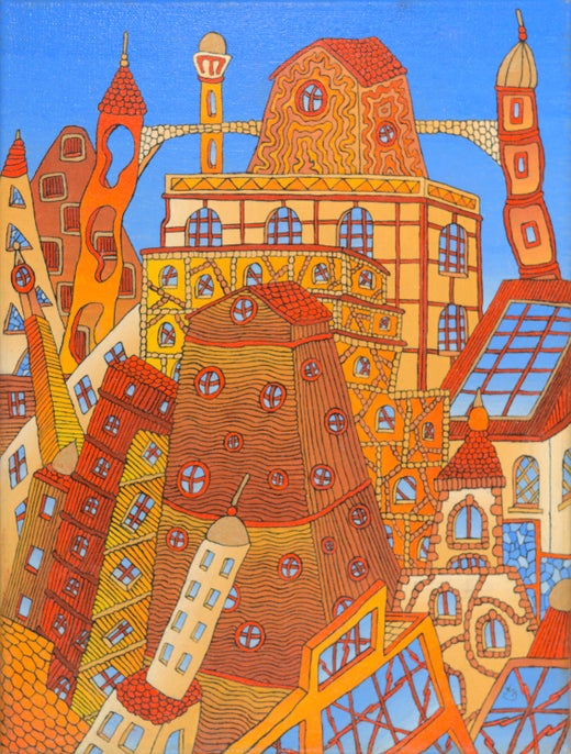 Labyrinths Network of Countless Red Orange Stairs w/ Blue Archs Gouache Painting