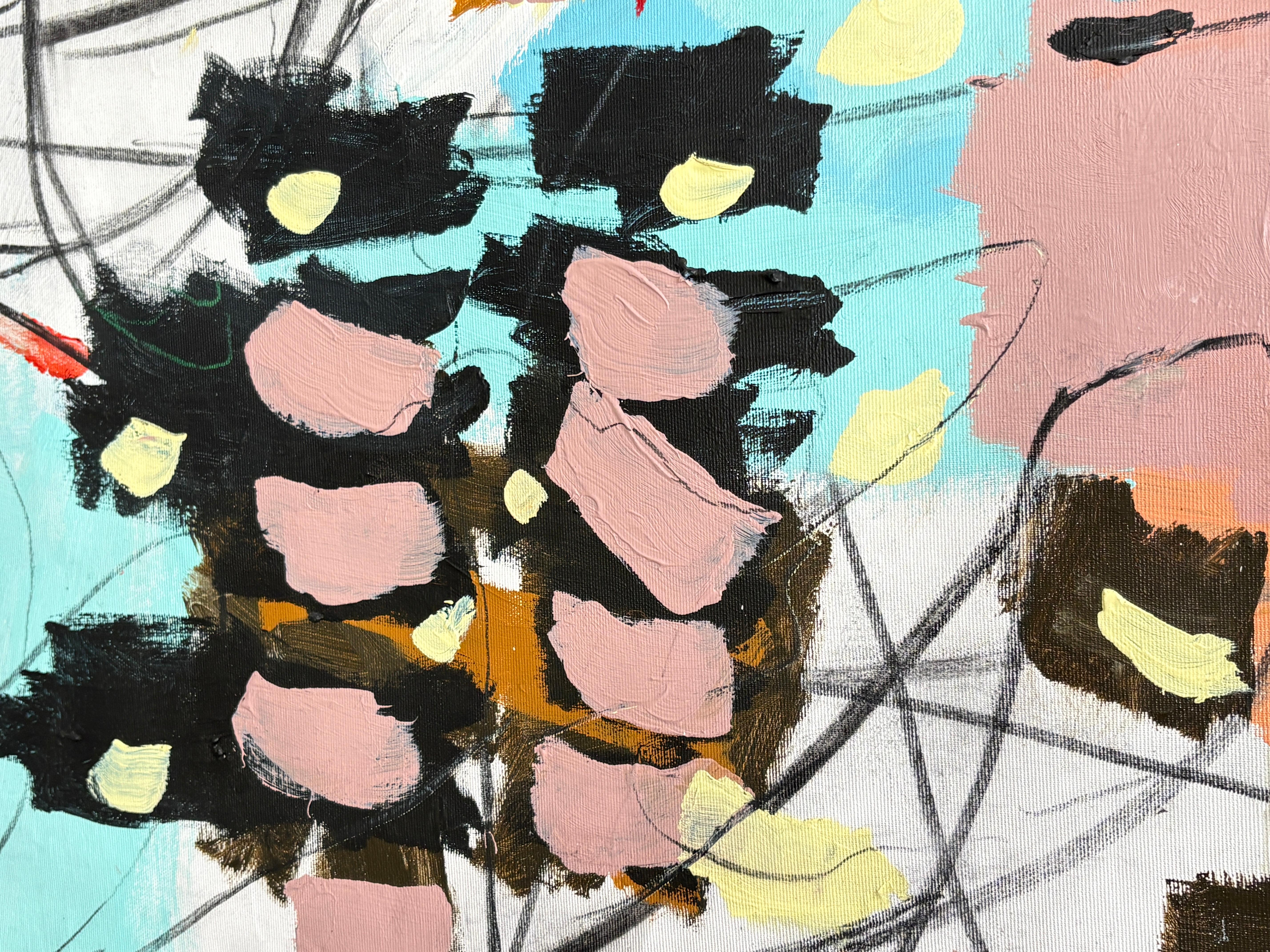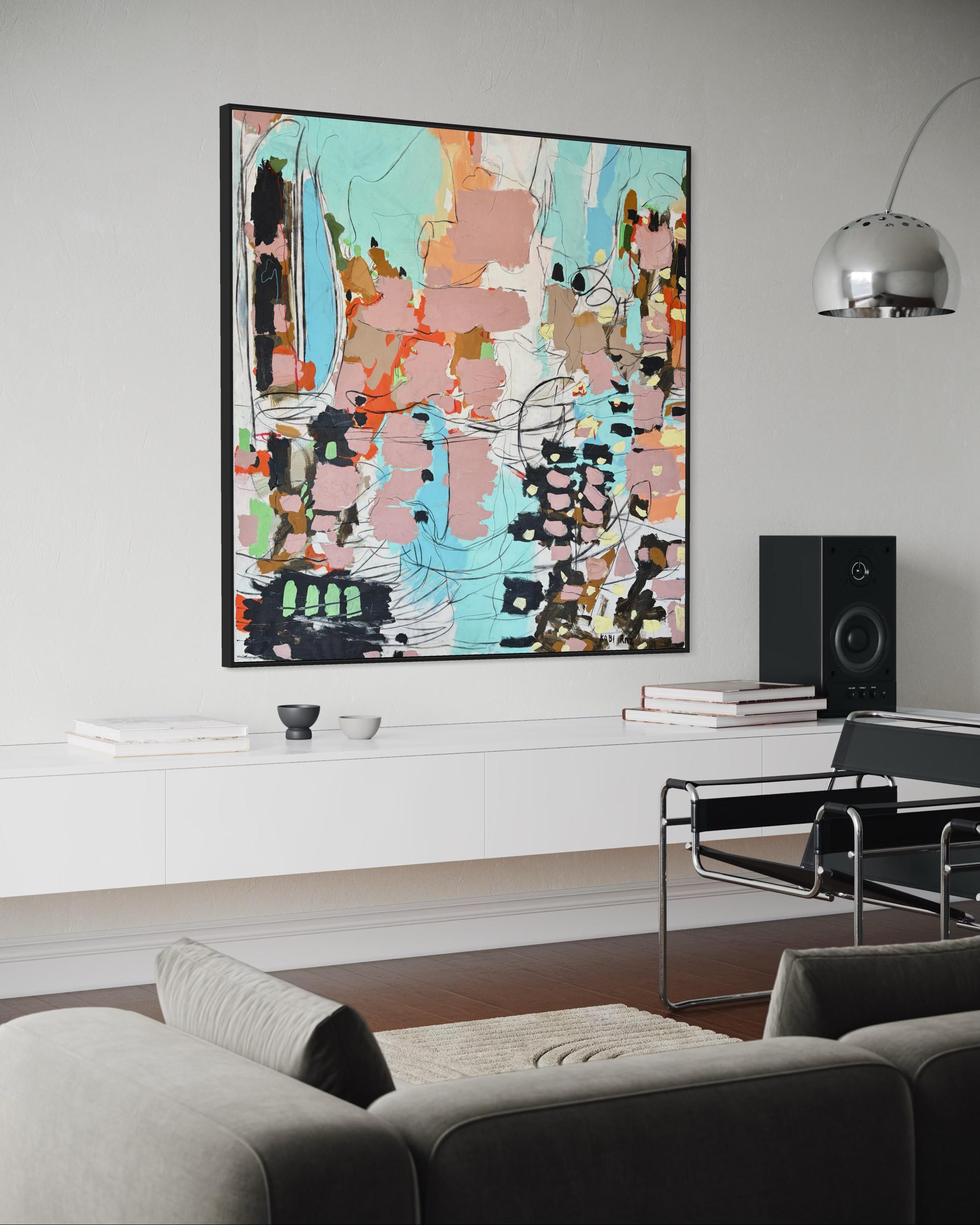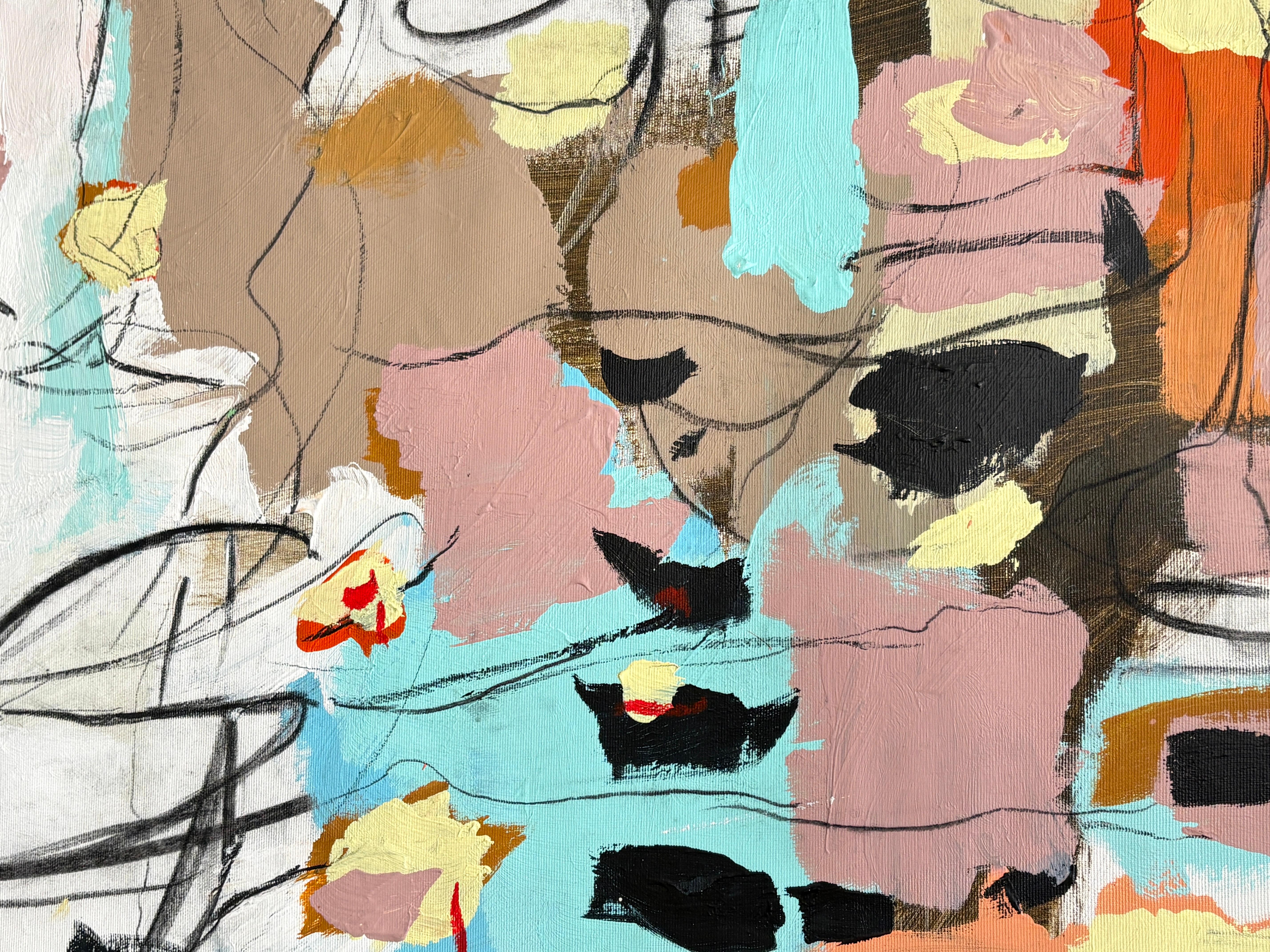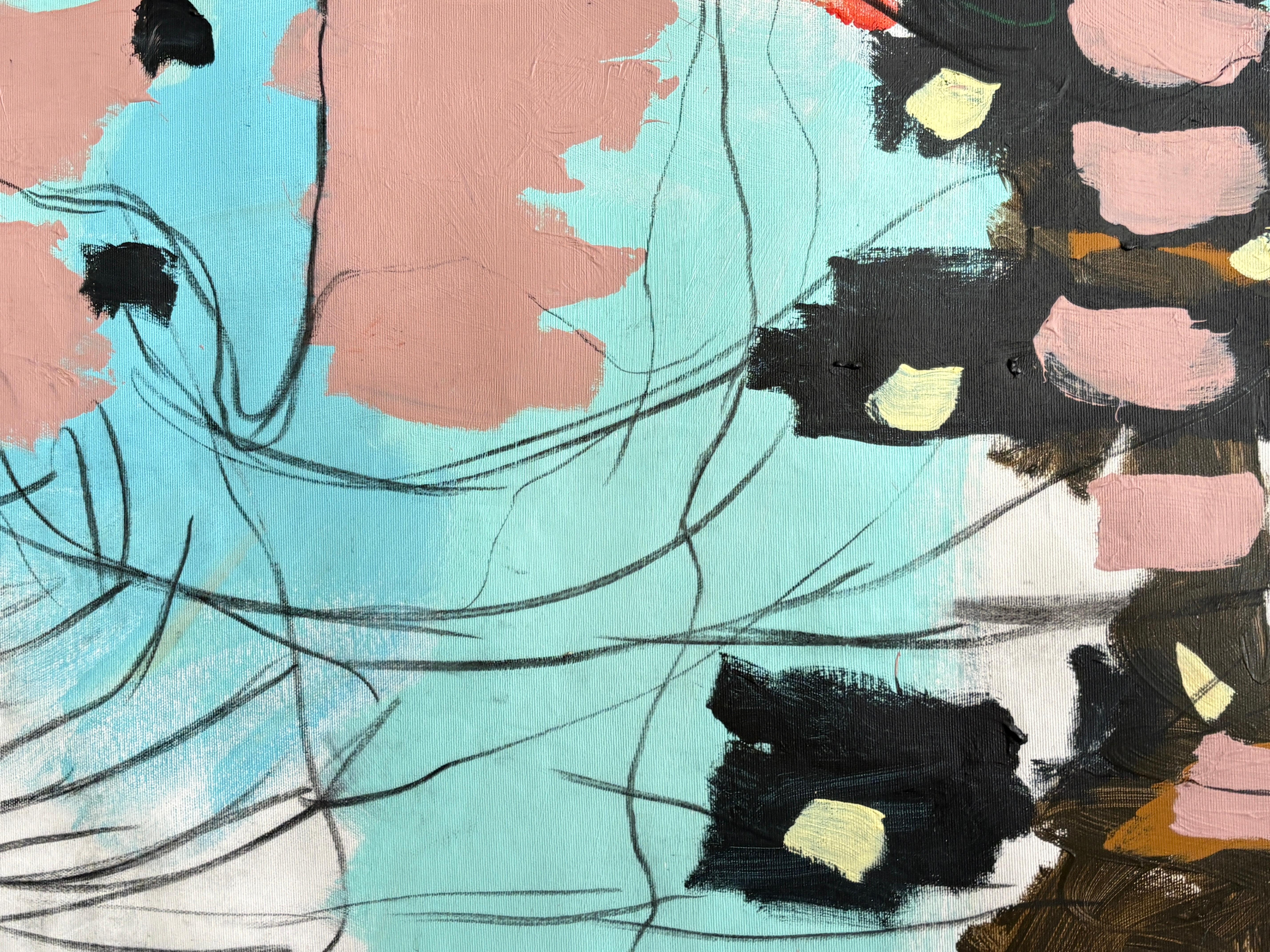 “Melody” is a lyrical abstract composition alive with rhythm, harmony, and color. Soft blush pinks, turquoise blues, and warm terracotta tones intertwine with expressive black and white linework, creating a visual cadence that feels both spontaneous and balanced. Raz’s painterly gestures and dynamic layering evoke the sensation of music translated into form, where each color becomes a note, and each line a movement within a greater composition.