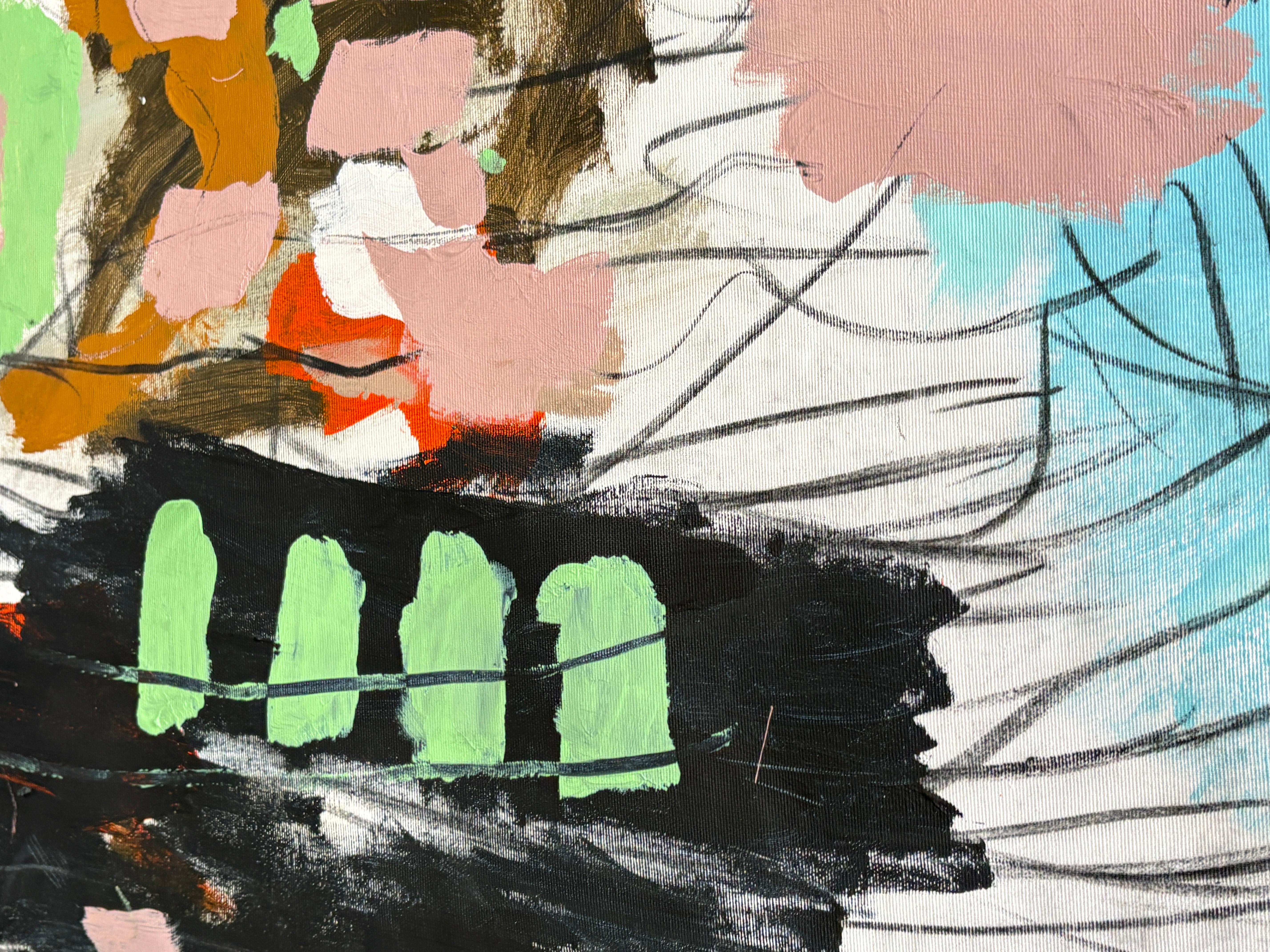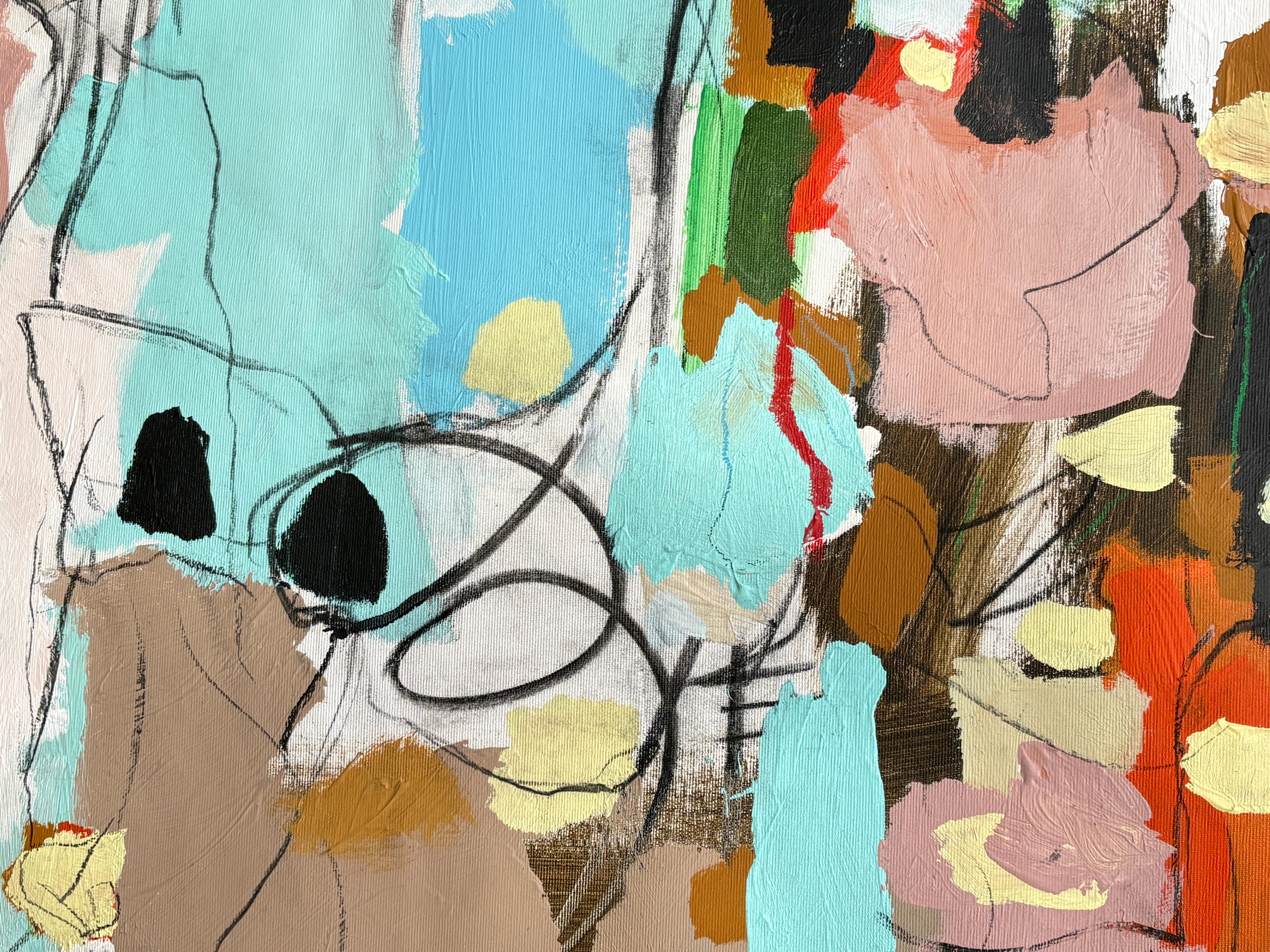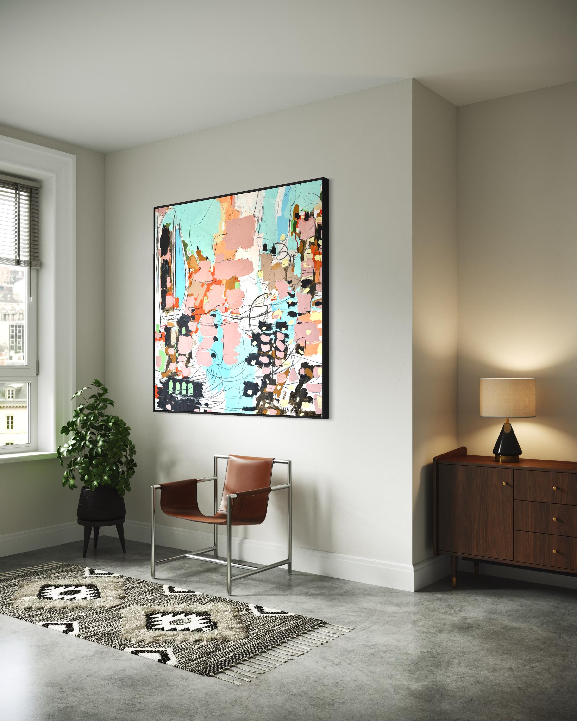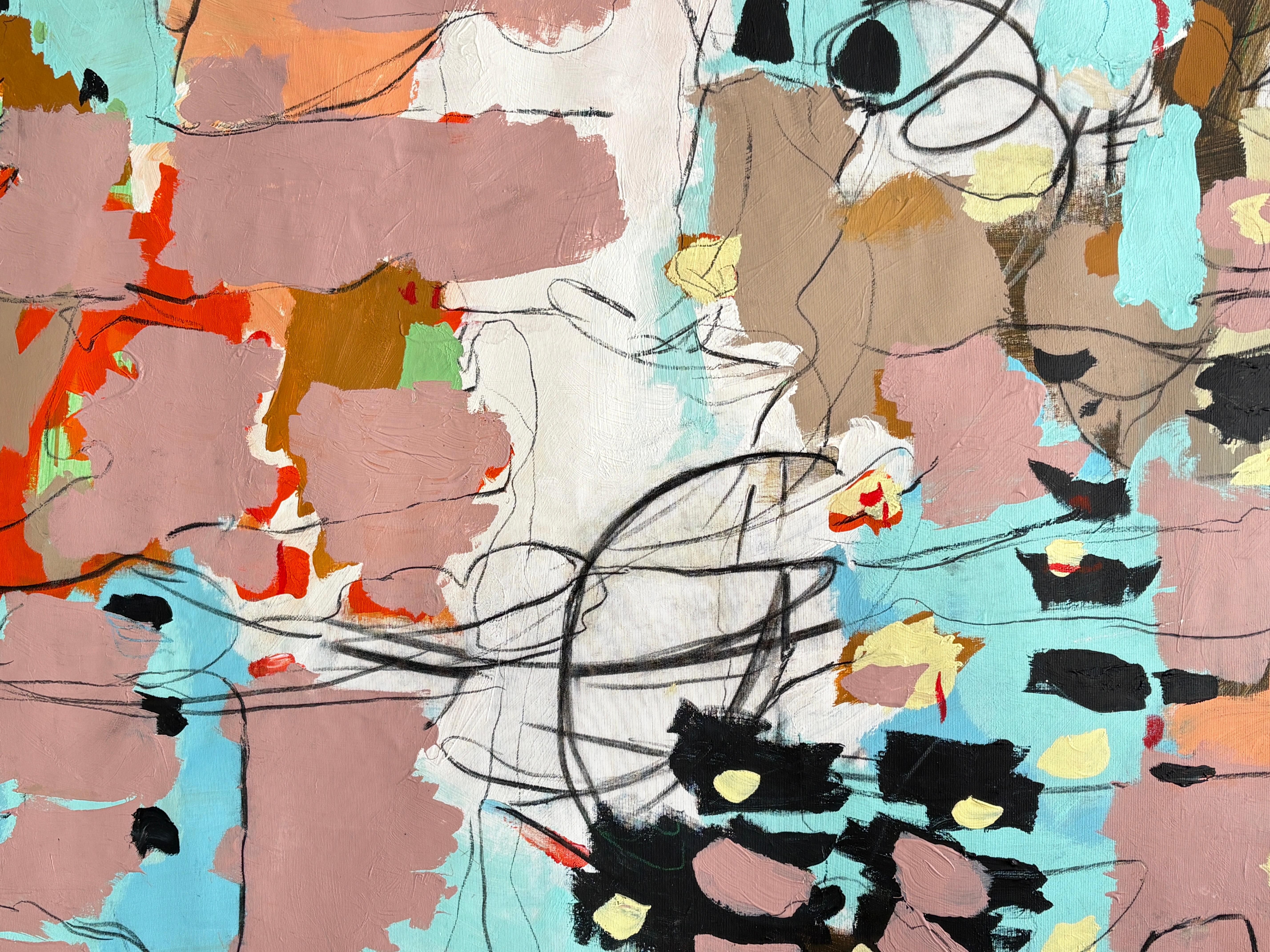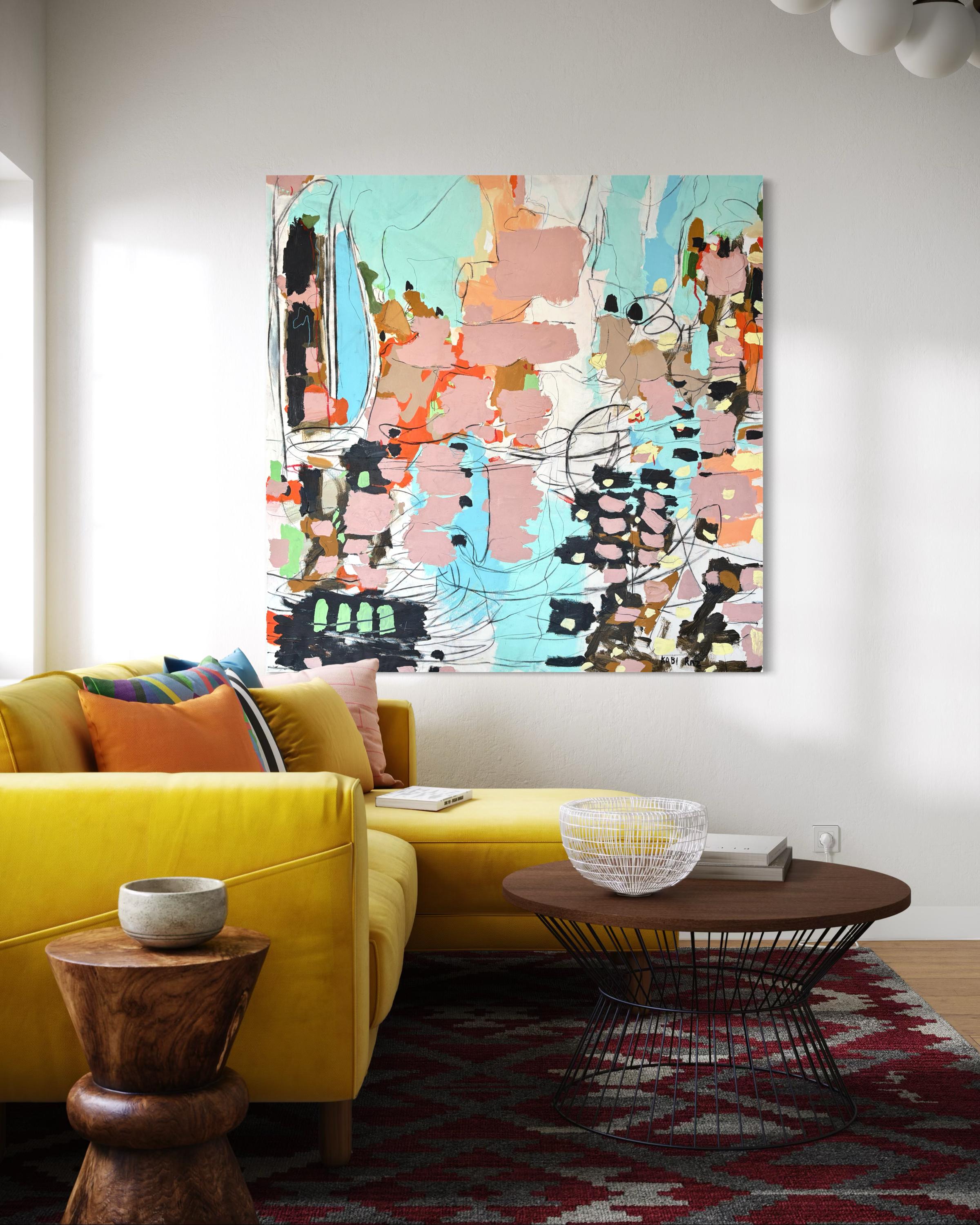 “Melody” is a lyrical abstract composition alive with rhythm, harmony, and color. Soft blush pinks, turquoise blues, and warm terracotta tones intertwine with expressive black and white linework, creating a visual cadence that feels both spontaneous and balanced. Raz’s painterly gestures and dynamic layering evoke the sensation of music translated into form, where each color becomes a note, and each line a movement within a greater composition.