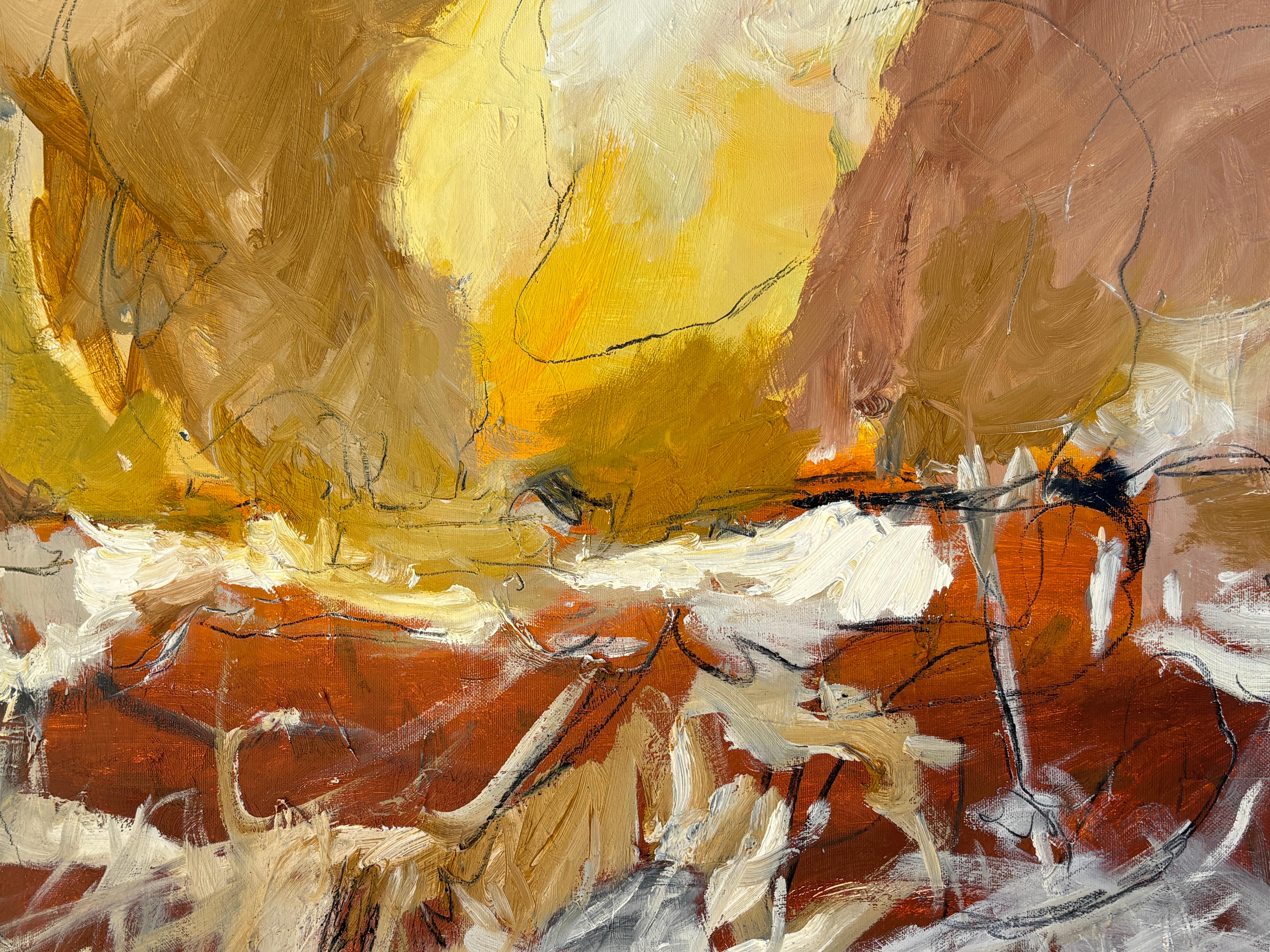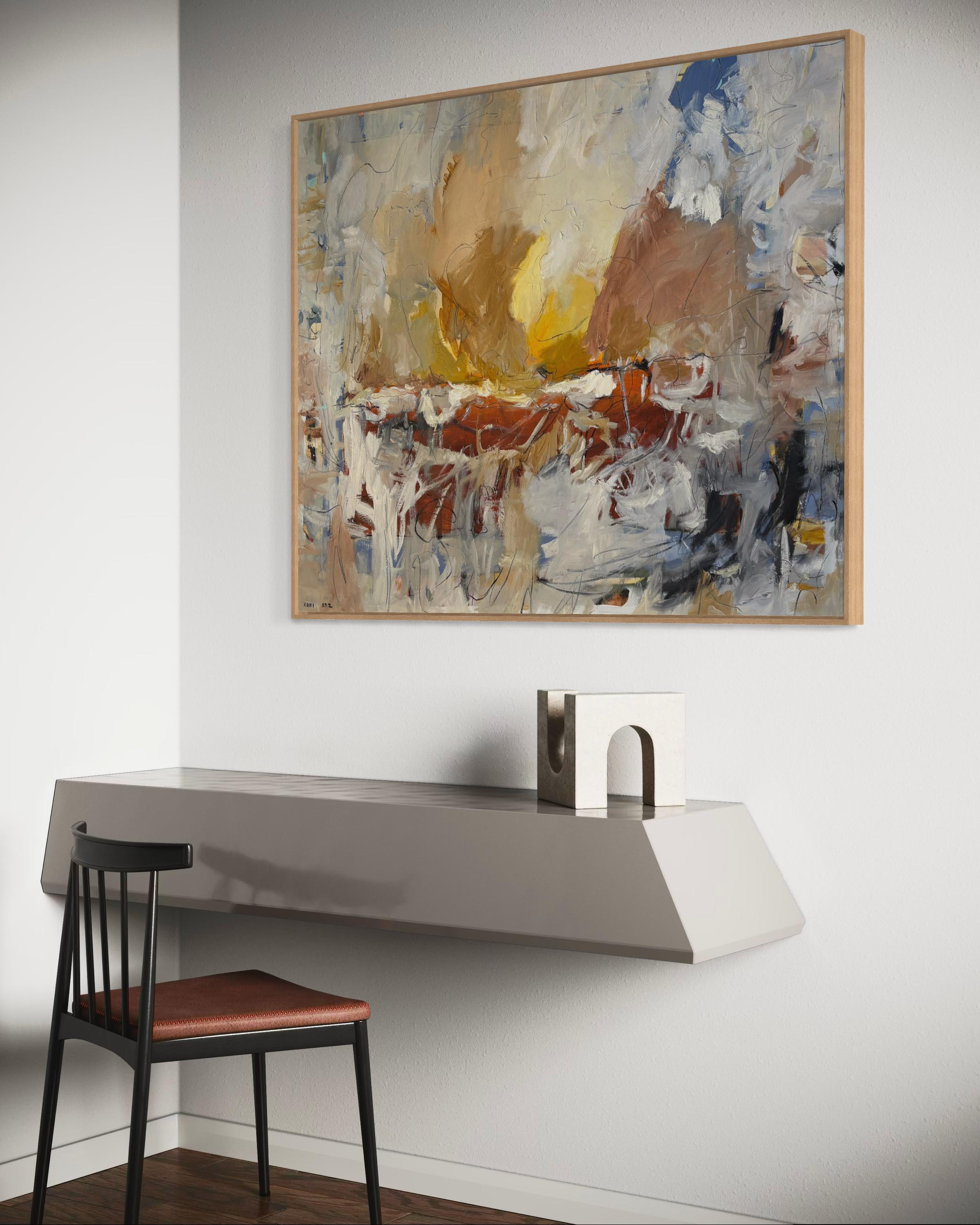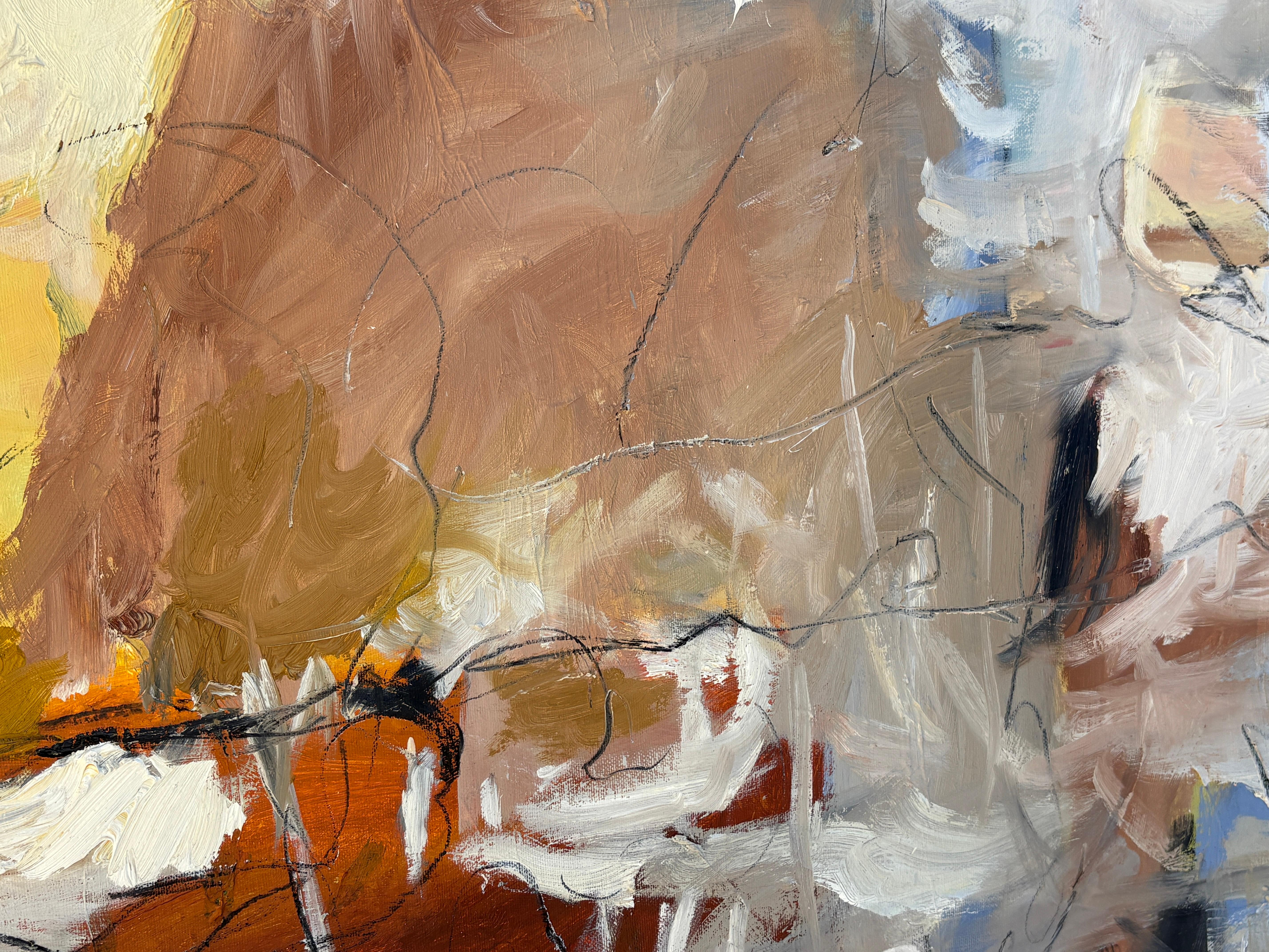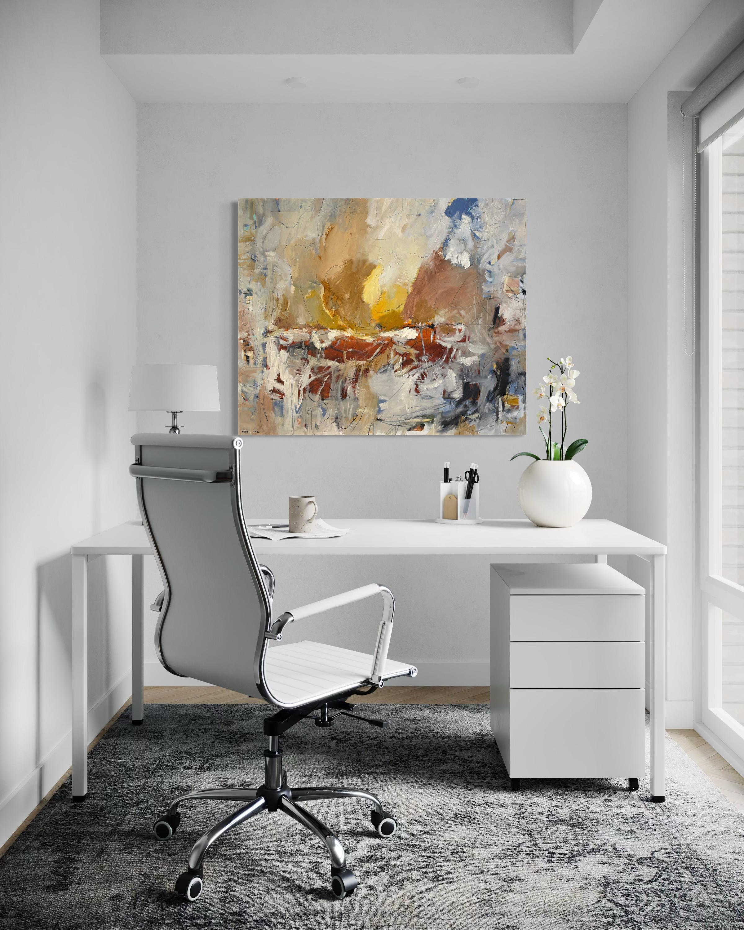 Kobi Raz explores the expressive power of color and movement through a richly textured composition. Swaths of ochre, sienna, and white converge with gestural marks and layered brushwork, creating a visual rhythm that feels both spontaneous and intentional. The painting evokes the shifting energy of nature—light, land, and atmosphere blending in a dynamic harmony. Raz’s use of abstraction conveys emotion through texture and tone rather than form, drawing the viewer into a deeply atmospheric experience. This work will resonate with collectors who appreciate contemporary abstraction, expressive landscapes, and modern paintings that bridge gesture and serenity.