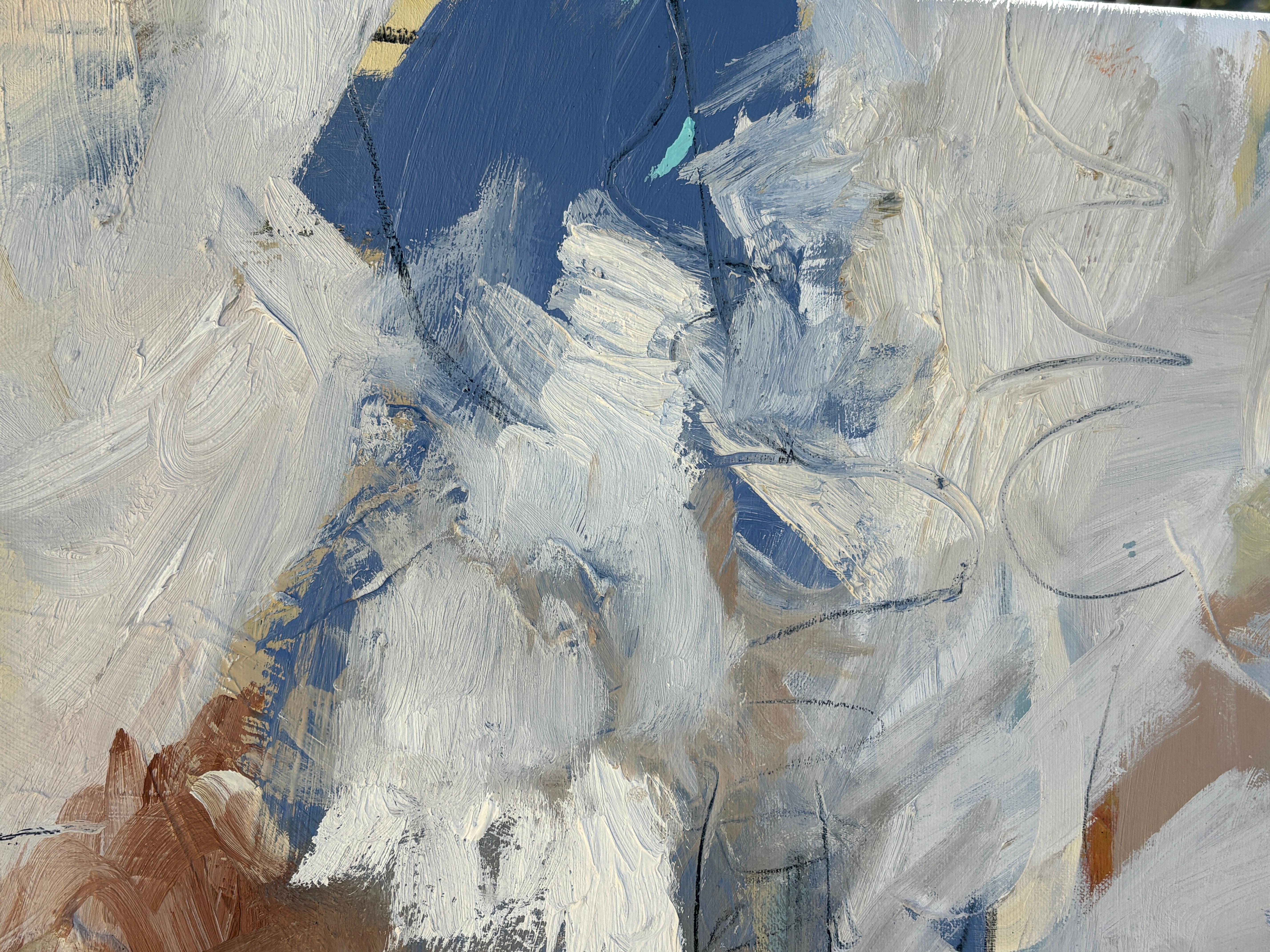 Layers of blue and cream with touches of orange and black create an energetic composition. The blending of colors evokes a strong sense of movement, while the s...