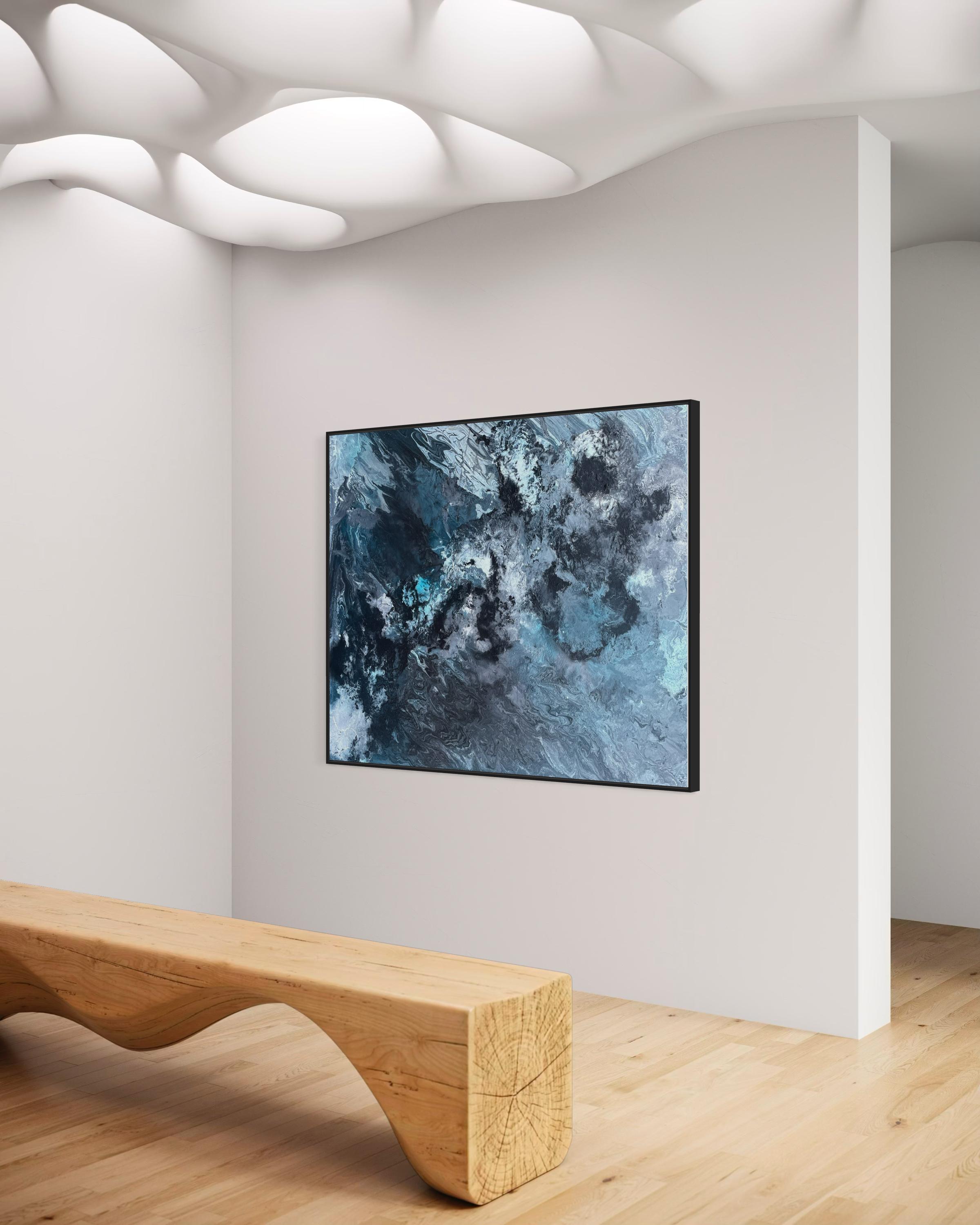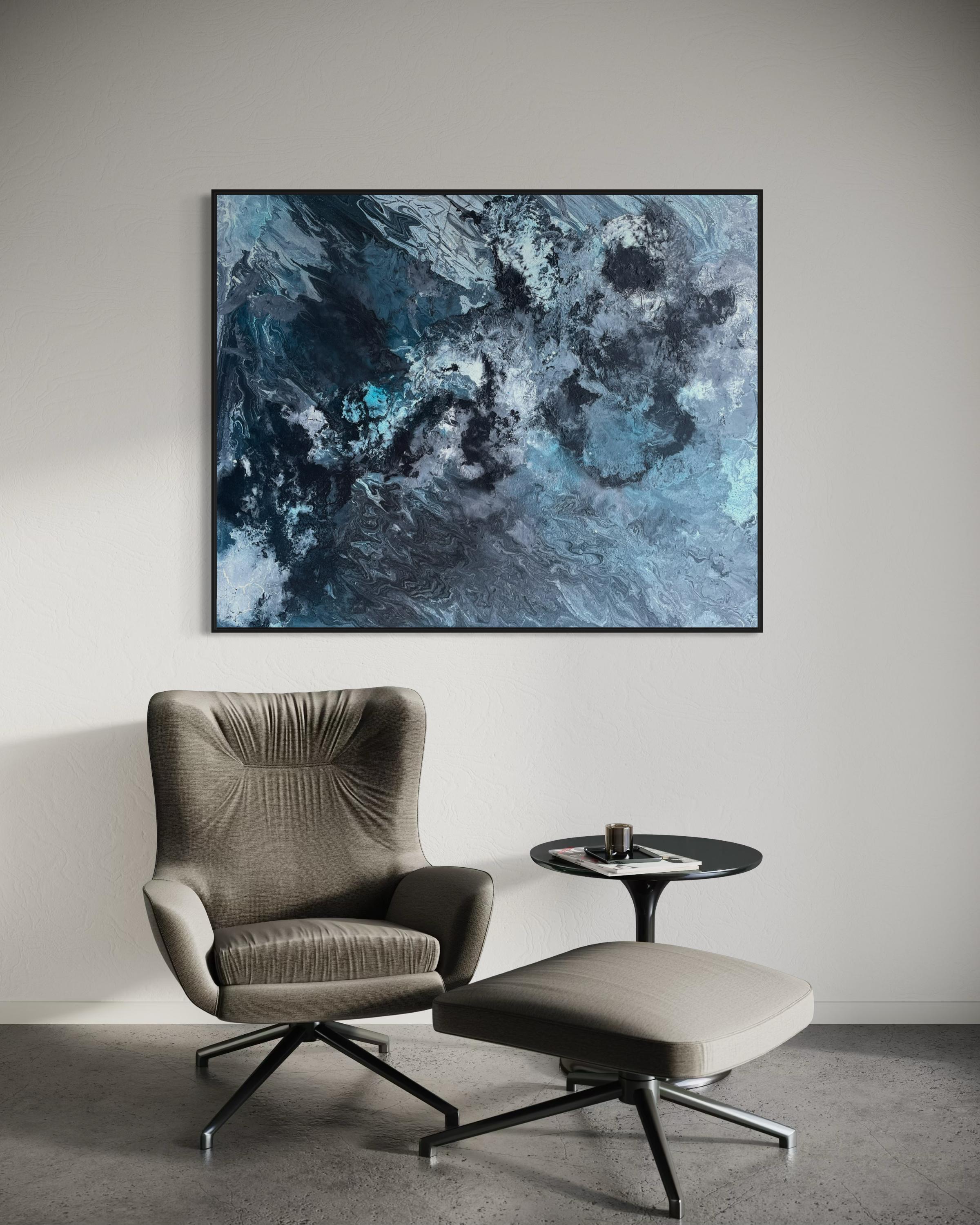 "Incoming Tide" embodies the dynamic forces of nature captured through abstraction. The artwork features a rich palette of deep blues, turquoise, and swirling grays that evoke the powerful and often unpredictable movements of ocean waves. These colors are contrasted by bursts of white and hints of black, simulating the frothy crests and shadowy depths of the sea. The painting’s textured layers and fluid, organic forms invite viewers to experience the visceral sensations of an ocean swell. The interplay of color and form not only suggests the ebb and flow of tides but also reflects the emotional depth and tumult often associated with the sea.