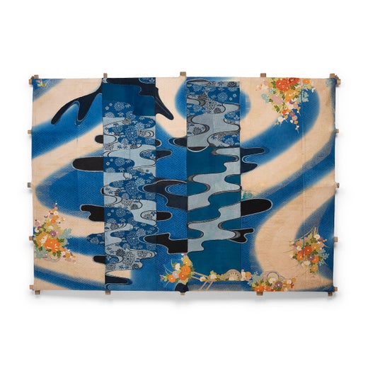 In “Furbelow I,” Thompson arranges scraps of Japanese silk to form a patchwork of contrasting pattern and color. Placed with balanced asymmetry, the panels of deep indigo and sheer silk create a dark, moody atmosphere reminiscent of a night sky. Gradients of light to dark evoke soft, moonlit clouds and delicate pine branches appear as forked bolts of...