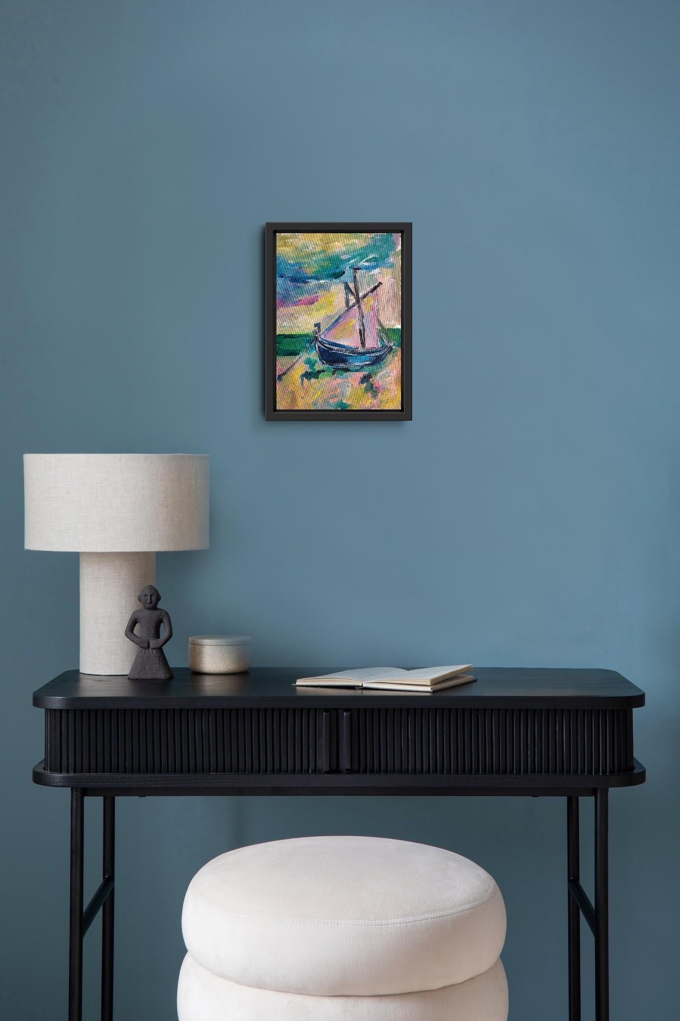 In this luminous work, a solitary boat rests near the shore, its mast and delicate, translucent sails rising into a sky animated by shifting turquoise, aquamarine, and muted golden tones. The scene feels suspended in time — a poetic balance between stillness and movement, silence and anticipation.