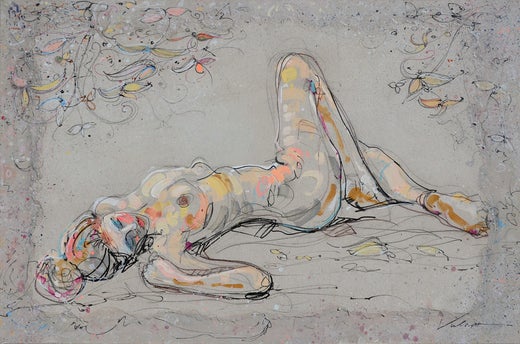 "Flowery Offering", Nude Woman Lasciviously Laying Colored Mixed Media Painting