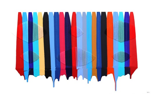 De la Torre has a unique painting style that allows the materials to become the stars of each piece. He begins by choosing a color palette that conveys certain moments, people or feelings. Using acrylic paints, he creates blocks of colors that intertwine in patterns on the canvas. Finally, he makes numerous horizontal cuts into the piece and weaves cotton thread into the area, giving it an additional dimension.