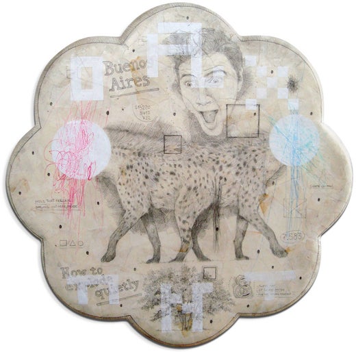 Santiago Fuente Bo was born in 1975 in Buenos Aires, Argentina. He was taught art in Centro Polivalente de Arte de San Isidro and Instituto Universitario Nacional del Arte, Bachelor in Fine Arts, and graphic design at University of Buenos Aires. Since the early years, he worked as an independent artist, a graphic designer and illustrator. In 1998 he got an Art Professor Diploma at IUNA, Instituto Universitario Nacional del Arte, Buenos Aires, Argentina. Fuentas Bo has a unique style in that he marries photorealism with surrealism. His work speaks about memories. Santiago connects personal memories with collective images. He takes from his dream world, and ties his story in each piece, bringing memories alive with pop imagery in surreal conceptions. He tells stories with timeless effortlessness; something that may seem mundane but becomes conscious in his dream like world. Fuentes Bo displays a graphic style as he starts creating with enamel, pencils and pens on wood or PVC, connecting the world of street art and graphic design that he comes from, and creating fantastic and delirious images with an urbane and contemporary sense of humor. His hallucinatingly refined depictions of animals remind us of Frans Snyders’ portraits; that’s how we have a Dutch still life in the midst of chaotic graffiti, randomly annotated supermarket receipts, slogans, pixels, and coffee spots. The result is paintings with object-like feeling. Pieces of something that could have a previous life. Half stories with no ending. A celebration of everyday life through everyday elements. After years working as illustrator and in the advertising industry, in 2011 he moved to Nicosia, Cyprus and set up his studio where he produces his artwork and teaches art. His work is part of private collections in Buenos Aires, Nicosia and Larnaca.