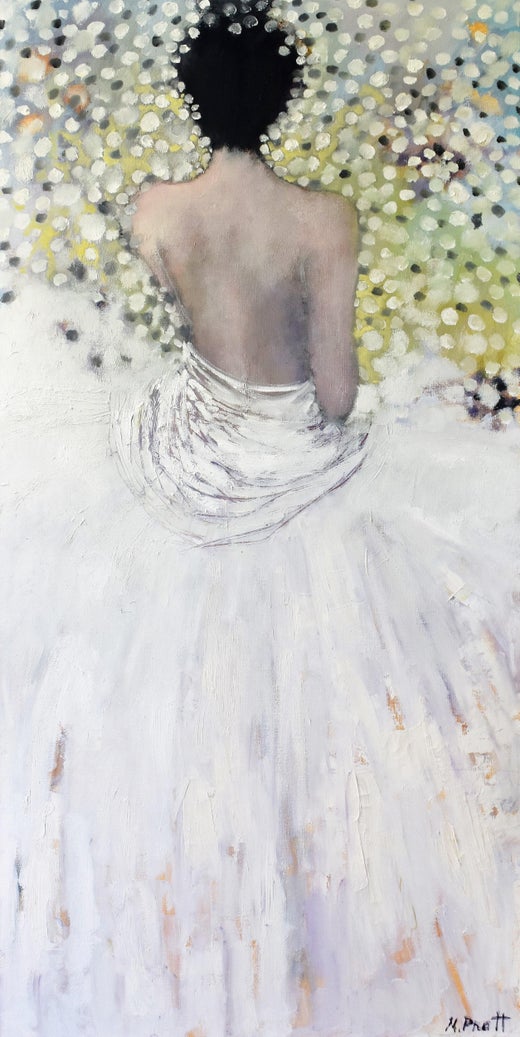 Artist Mary Pratt paints an ethereal figure with a billowing gossamer white skirt. The woman gazes through a sea of floating lights, framing her and spilling ...