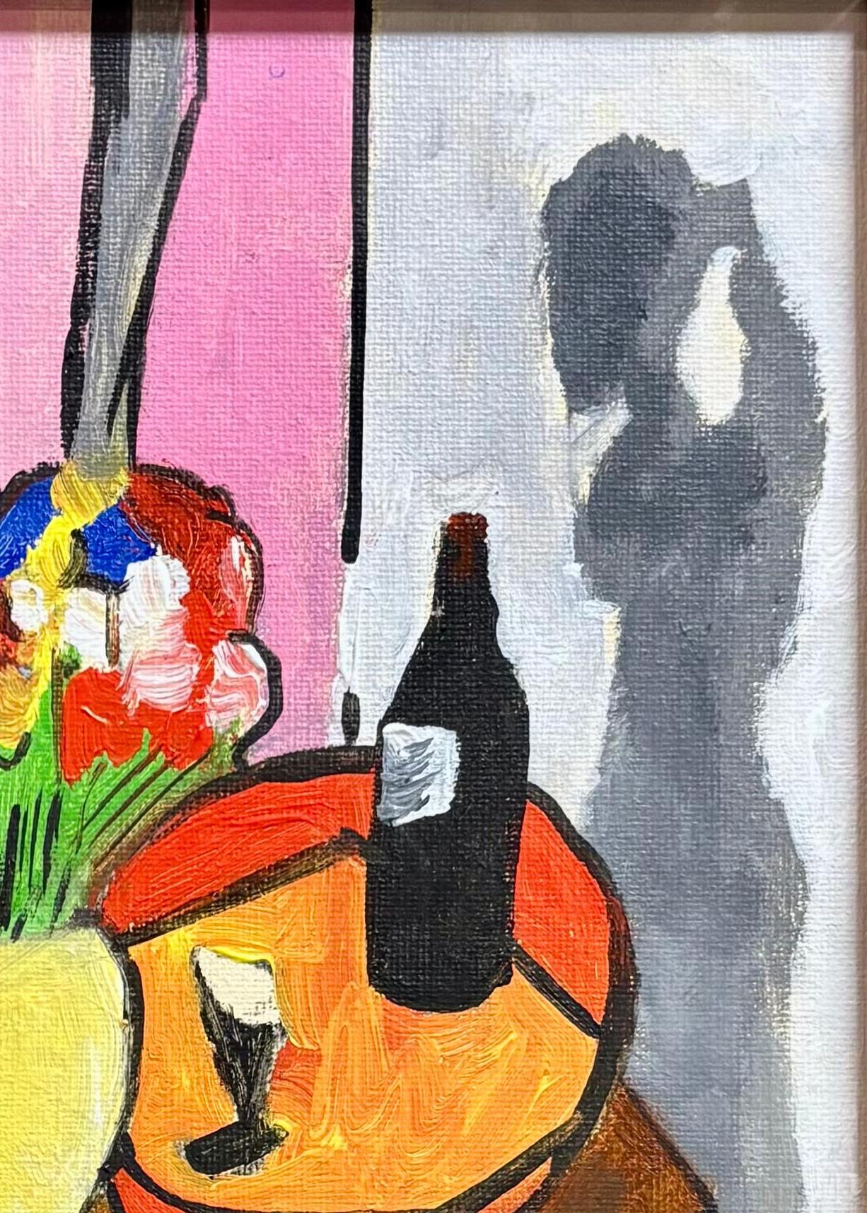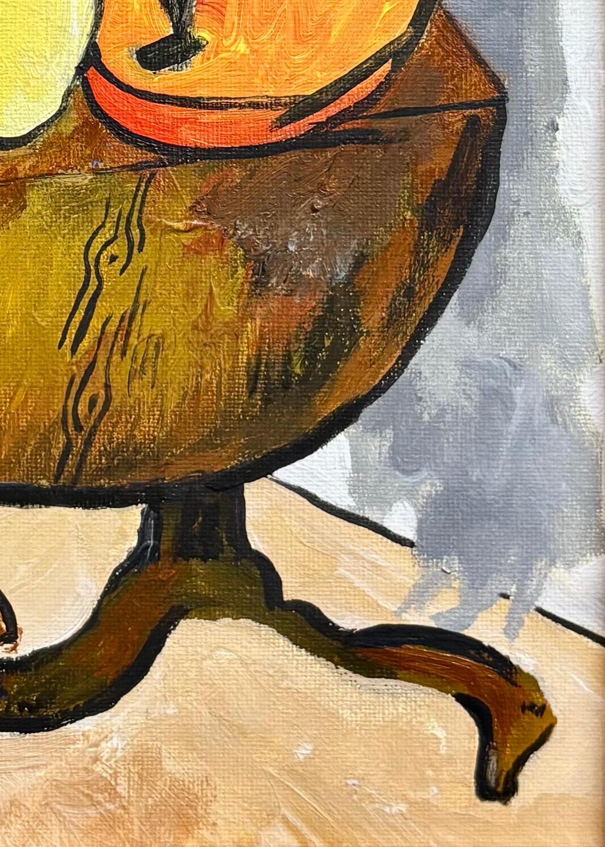 Mathias’s angular brushwork and vibrant palette merge representation and abstraction, transforming an everyday tea scene into a rhythmic interplay of form and color. The shadowy silhouette on the right wall introduces a subtle human presence, a hallmark of the artist’s diachronic approach, where moments overlap within a single frame.