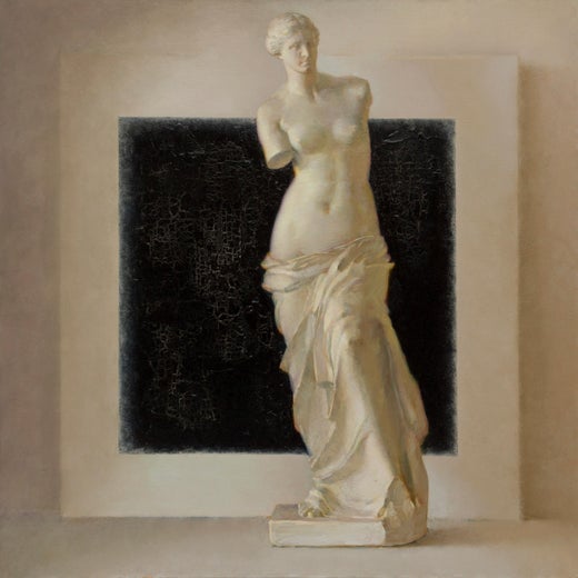 The painting features two pieces of art. The difference between their creation is about 2000 years. The first is the sculpture, Venus de Milo, the most famous of all ancient Venuses. One of the peaks of ancient Greek art. The second work is a painting by Kazimir Malevich "Black Square", created in 1915. This is one of the most talked about and most famous paintings in the world of art.