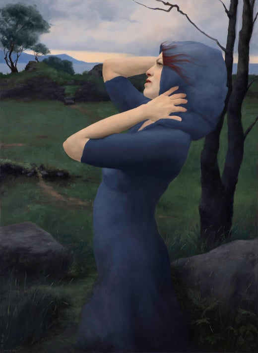 As I worked the long hours in the studio during the pandemic, these paintings of Ireland served as an escape from current affairs of the world, and at the same time forced me to think deeper about issues such as my identity. A smaller work, of a single standing stone for example, would serve as an escape—I loved to get lost in building up the textures layer by layer. Or I could escape into the ancient stone circles and imagine a connection to a culture long disappeared. Then there was me. I’m the person in all these figurative paintings, and I spent countless hours staring at myself. In past work I am just one of many muses for any given series, with the overall feeling always outweighing portrait likeness. I’m pretty good at separating me from my painted image, but this time it was harder. I found myself thinking more about my own identity – how I see myself vs. how the world sees me. I am of mixed race—neither fully in one world nor the other. I wondered if I would lose my culture when my mom (the clear link to my Chinese heritage) is gone. This brought me, in one painting, to incorporate her features into my own. In other works, I found my technique of obscuring the lines of the dress with overlapping clouds taking on new meaning, expressing the veiled complexity of who I am.