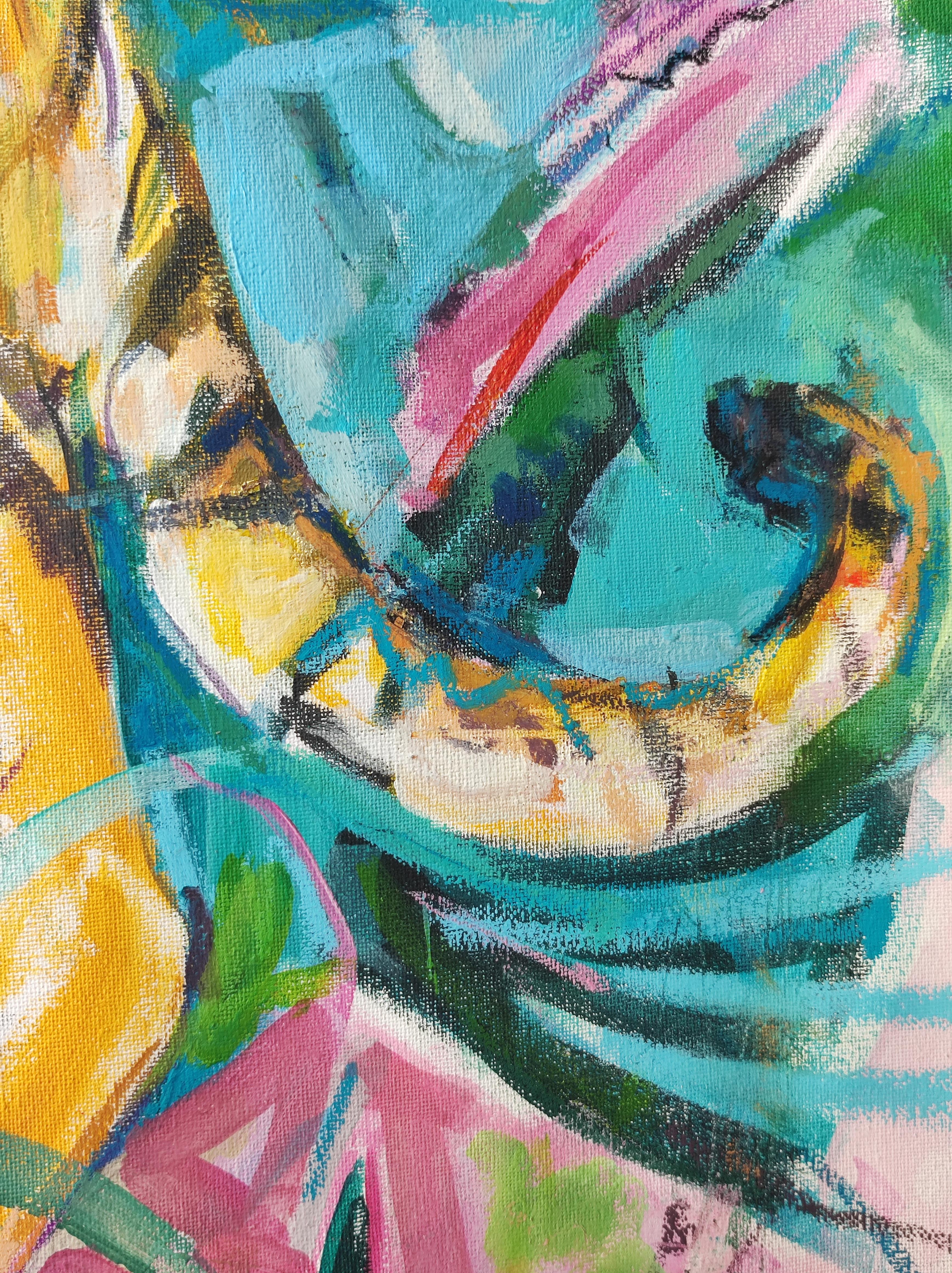 "Find Your Own Way" is a very vivid and colorful acrylic artwork. The main colors are orange, turquoise, yellow, green and red with a tiny bit of white. The artwork is a statement pi...