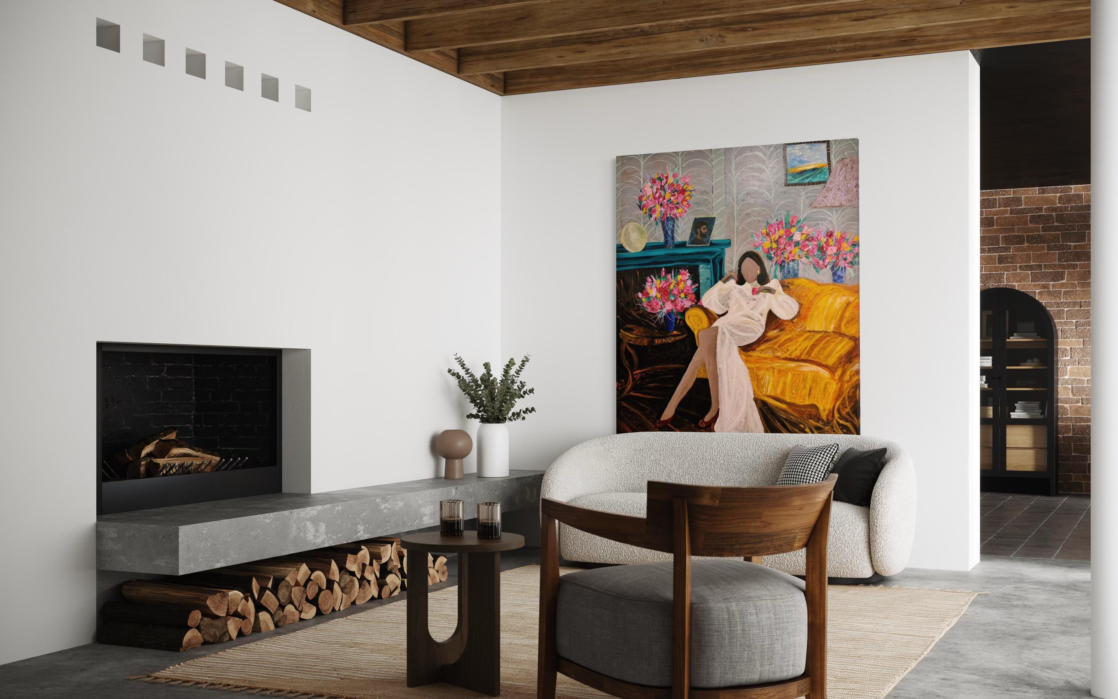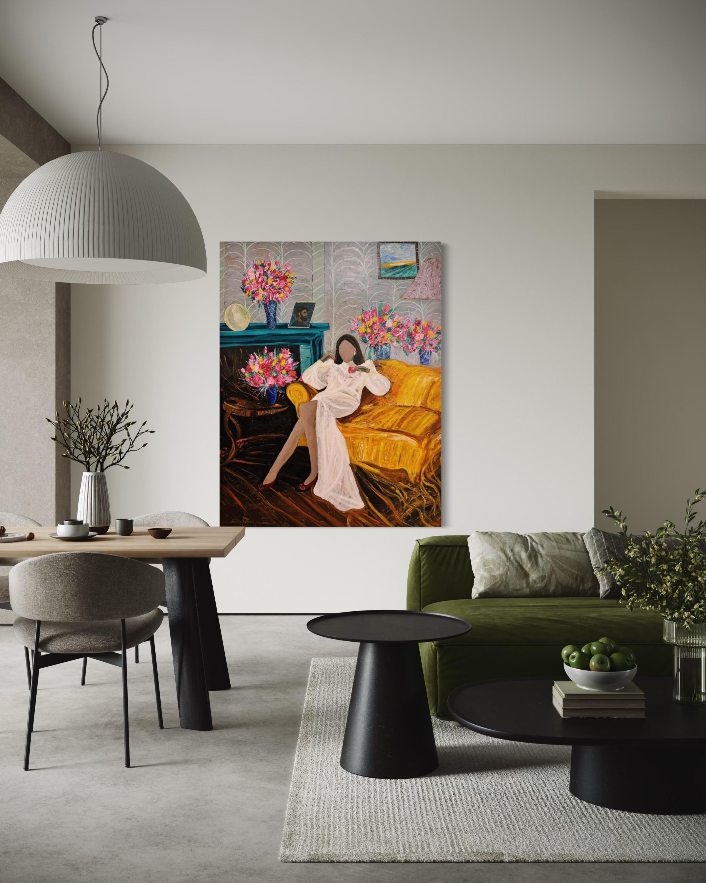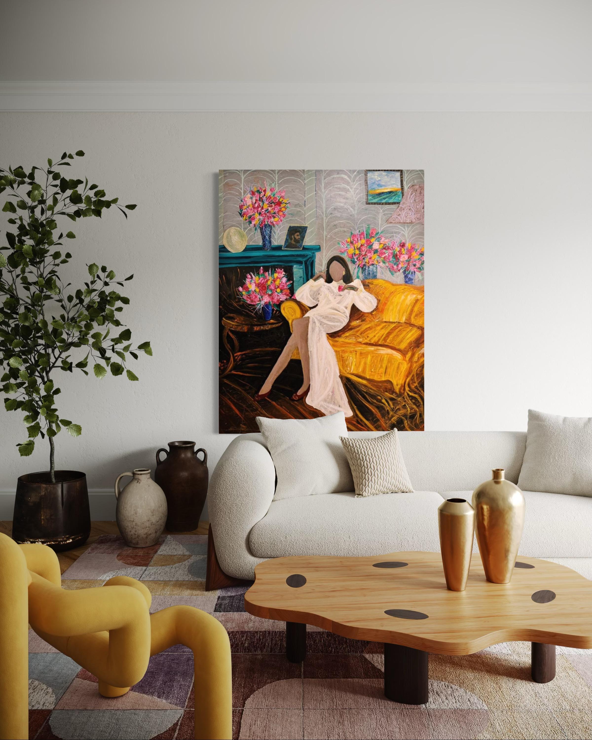 “Floral Muse” is a vibrant and emotive large painting (70 x 100 cm / 27.5 x 39.5 in) that blends figurative and abstract styles from Natalya Mougenot’s ongoing series dedicated to Wo...