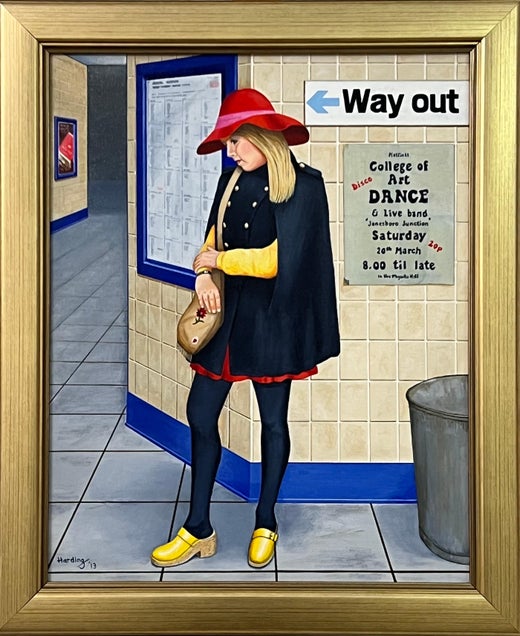 Vintage English Woman waiting at the Train Station 1960's 1970's England by Retro Nostalgic Artist, Paul F Harding. Signed, Original, Oil on Canvas. Pre...