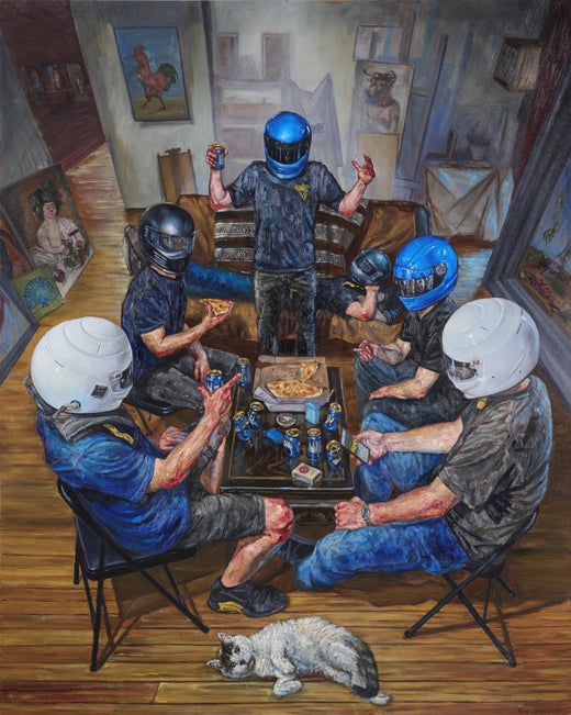 "@BreakingBianski" is an oil painting by Peter Lupkin that captures the quiet intensity of a drifting driver in a rare moment of stillness. Seated with hands clasped and shoulders re...