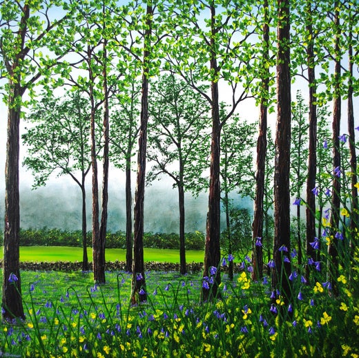 Painting of a river, flowing through a forest, in the heart of the welsh country side . I have painted this scene in the season of spring, and I have added bluebells for a sign of l...