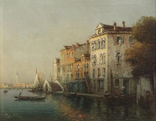 Bouvard Antoine ( Aldine Marc ) was born at Saint-Jean-de-Bournay in L’Isere in 1870. He originally trained as an architect and studied art and architecture under Constance-Dufeus, at the Ecole des Beaux Arts in Paris. He became the Director of Architectural Services for the Seine and was responsible for the construction of the Bourse du Travail and also for the Boulevard Morland in Paris. On one of his numerous painting trips to Venice he met the noted Venetian artist Felix Ziem. From that moment this artist greatly influenced his work for the remainder of his life. Painter’s love of Venice you can see in the delicacy and fluidity of his use of colour. As a master he succeeds to capture the warmth and beauty that he found in in the capital of northern Italy. Antione Bouvard is also known under the pseudonym of Marc Aldine, allowing him further success through alternative markets for his work. His works are delicately but confidently painted, capturing all the charm of one of the most romantic cities in the world. This artist became very popular because of his sensitive understanding of Venice. He demonstrates his architectural skill and Venice’s unique colour and light effects. He does capture the daily life and glamour of well-known scenes like the Grand Canal and the Santa Maria Della Salute and also by catching the atmosphere and serenity of the backwaters. Venice had always been a popular venue for visitors on the ‘Grand Tour’ throughout the 18th and 19th century. The city attracted visitors in greater numbers with the development of the European Rail Network in the second part of the 19th century. During his lifetime he exhibited throughout France and Italy as well as many provincial European Galleries. The painter’s works are internationally collected and have achieved great popularity and recognition in this present time. He is one of the most prolific painters of Venetian genre.