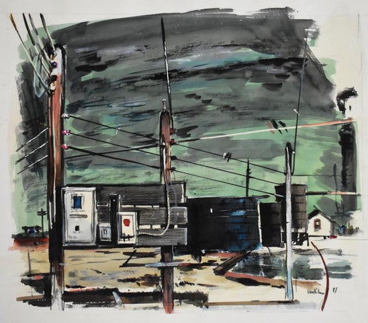 Buck Schiwetz"POWERLINES" ART ALSO ON BACK OF PAINTING. INDUSTRIAL SUBJECT1951
