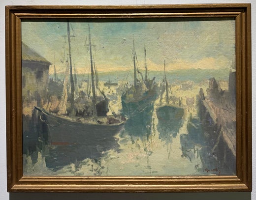 Cesare Ricciardi emigrated from Italy to the United States as a young boy. Ricciardi was a painter of society portraits, as well as landscapes of Addingham, Bucks, Delaware and Chester Counties and the Philadelphia area. Ricciardi began his formal art studies at the Philadelphia Sketch Club, before enrolling at the Pennsylvania Academy of the Fine Arts, where he received his most influential training under the instruction of Thomas Anshutz, Cecilia Beaux, Hugh Breckenridge, Robert Henri and Leopold Seiffert. He later traveled to Paris for further studies. His trips to New England produced many marinescapes of moonlit harbors and dock scenes. He was a member of the Philadelphia Sketch Club and the Philadelphia Art Alliance. His work was exhibited at the Pennsylvania Academy, The Corcoran Biennials, the National Academy of Design and the Art Institute of Chicago. He lived most of his life in Philadelphia.