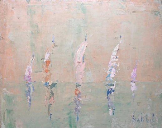 Rendered in thick, expressive brushstrokes, Lel captures the rugged charm of a French fishing village—possibly inspired by northern coastal towns such as Honfleur or Calais, where lighthouses serve as enduring maritime icons. The boats in the foreground are moored quietly, their dark hulls mirrored in the reflective water below, broken only by abstract shapes of light and colour. The red-roofed cottages and warehouse-like structures along the shoreline suggest a working port, bathed in the soft haze of a coastal morning or late afternoon.