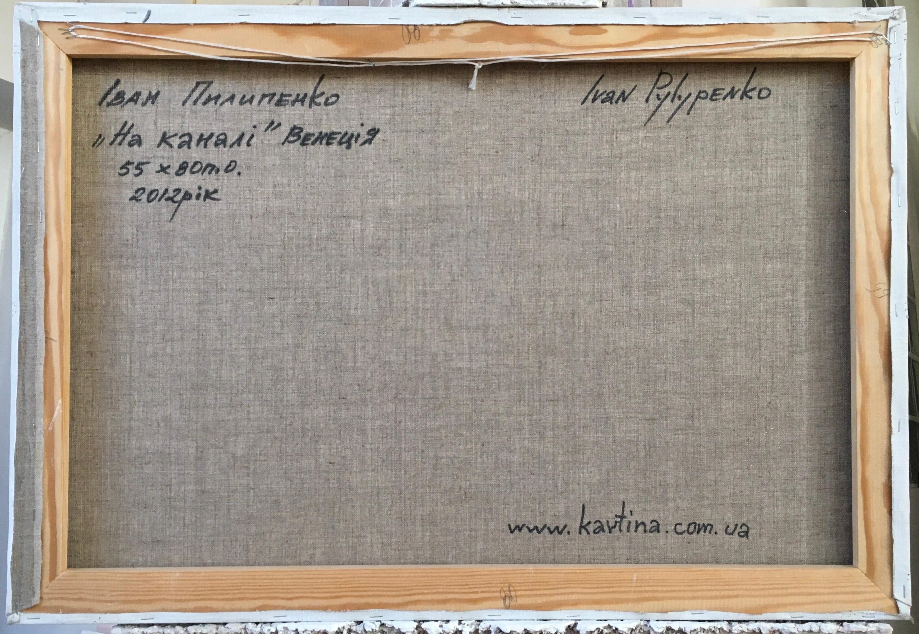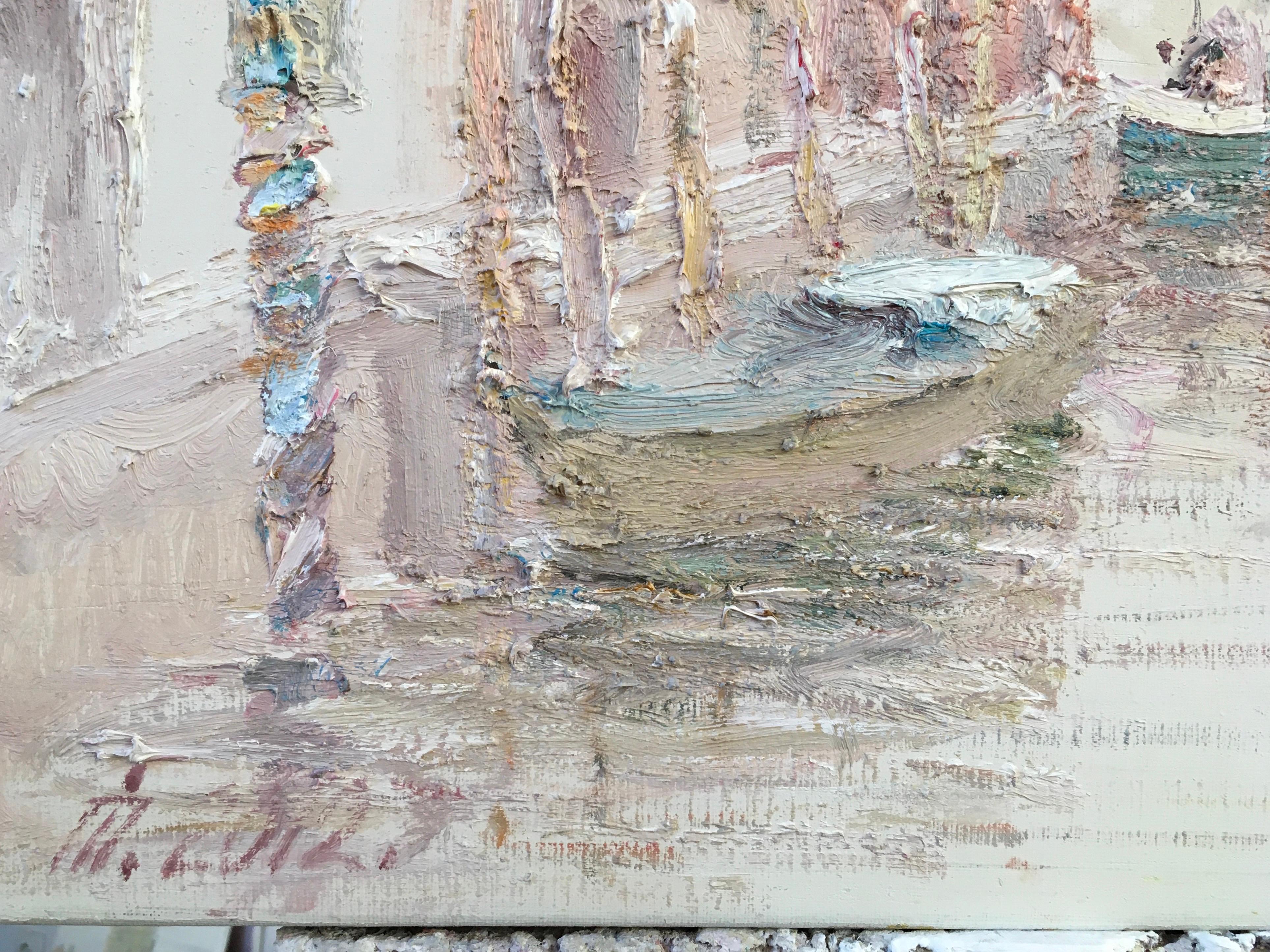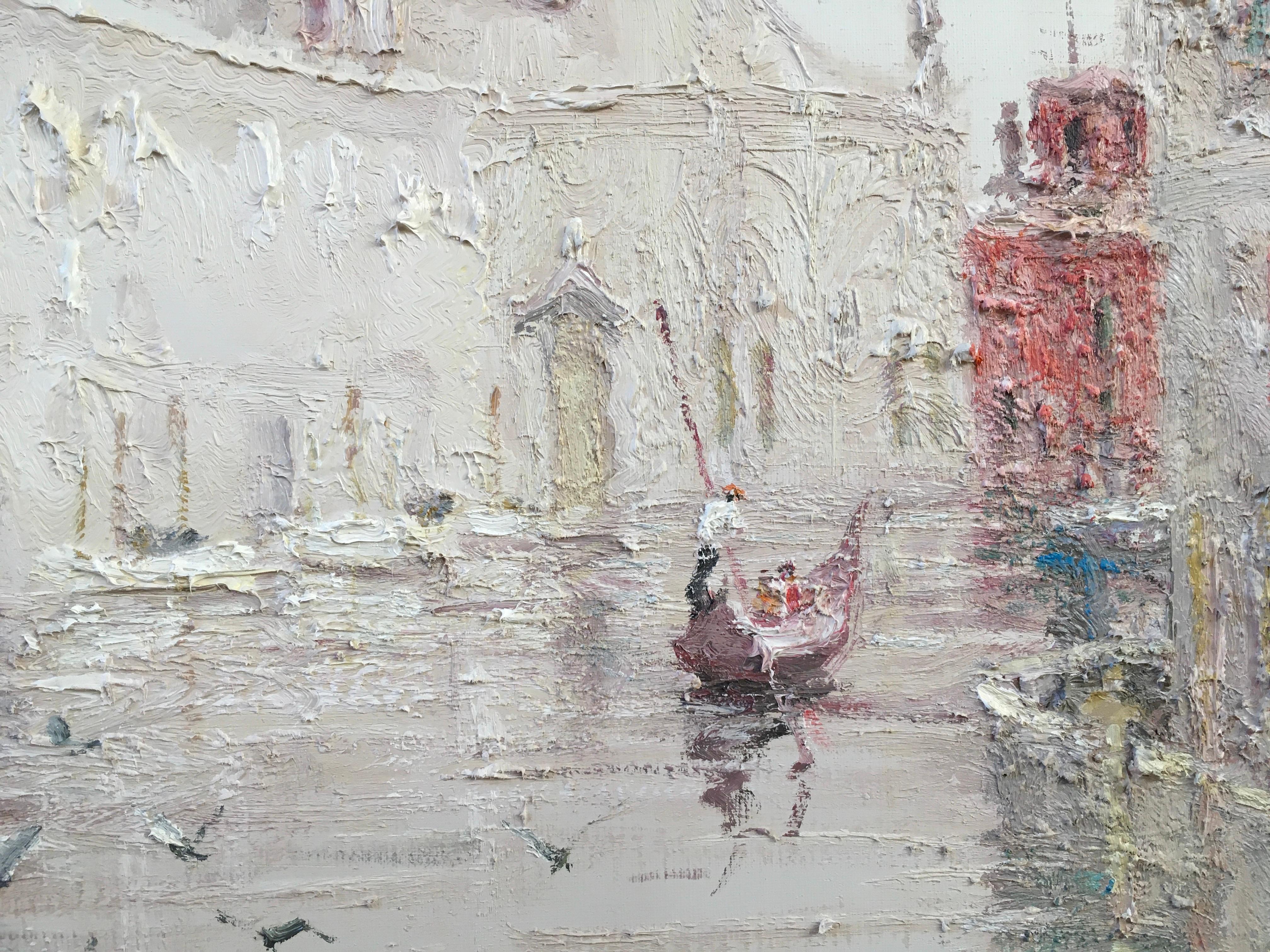 The painting depicts a picturesque scene with gondolas on a canal in Venice. The artist used an impasto technique: thick strokes of paint create a relief, almost sculptural surface o...