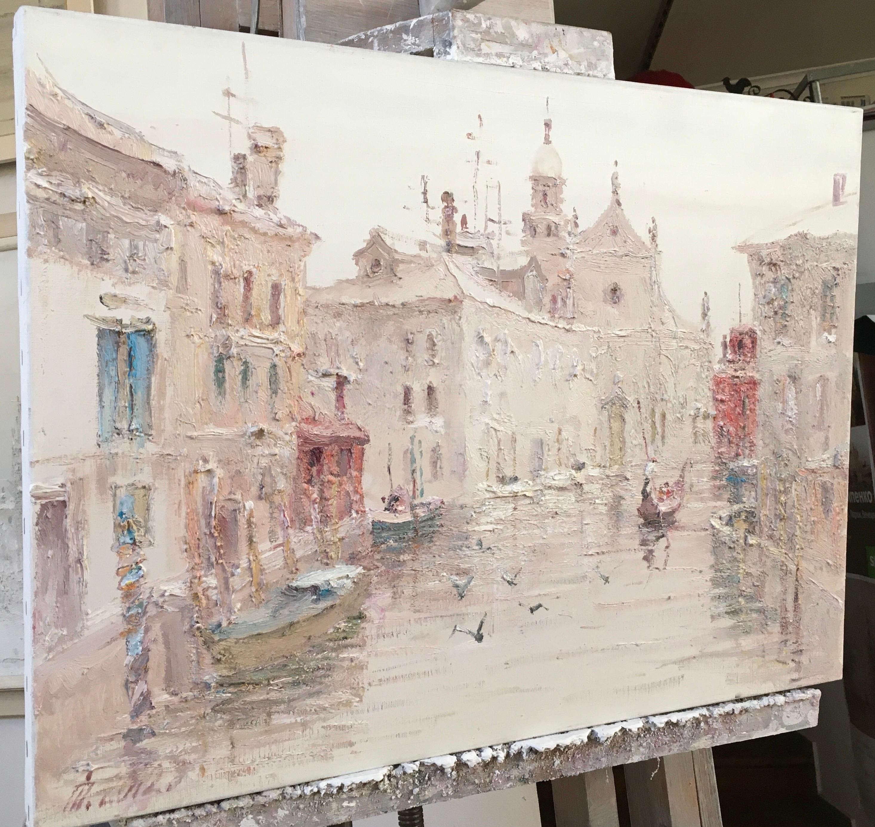 This is a soft, atmospheric painting, executed in pastel, muted tones that create the feeling of a light mist over the city. The canvas depicts a Venetian canal surrounded by ancient buildings in warm cream, pink, and ochre tones. The texture of the brushstrokes is expressive and relief-like — the paint is applied thickly, impressionistically, making the light seem to flicker on the surface of the walls and water.