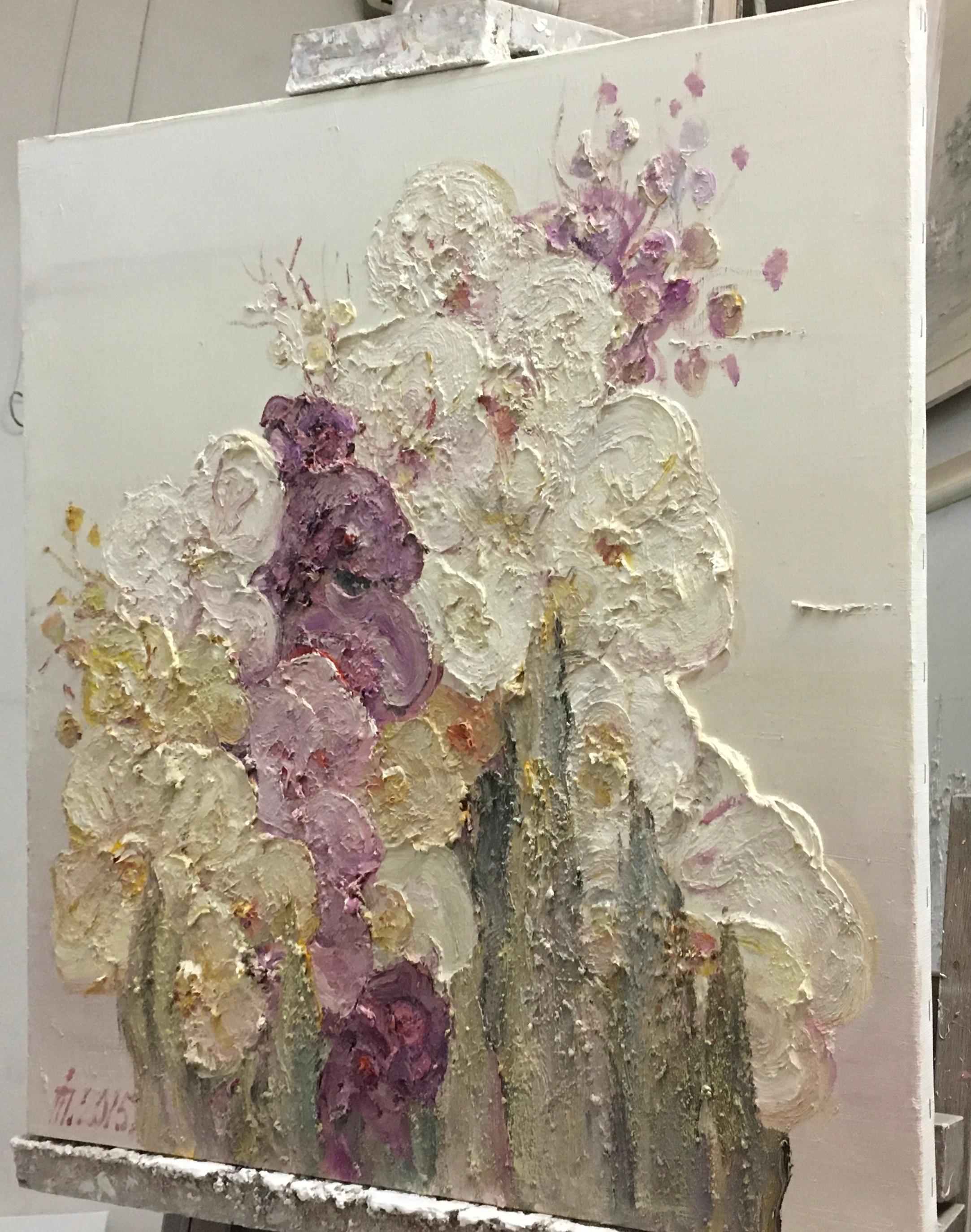 The canvas depicts a lush floral composition in a light, almost airy palette. Milky white, cream, and soft lilac shades dominate. Some flowers have a more saturated purple color, which adds depth and accents to the composition.