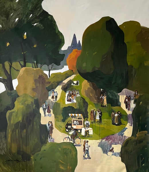 The composition weaves together movement and stillness, where winding roads and clustered figures create a rhythm of shared presence.