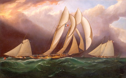 Ives as subjects for lithographs. His images were also used in magazines and newspapers that reported the yachting events of the day. New York Harbor and the surrounding areas became a favorite background for his vessels which he portrayed faithfully with an eye for precise detail. His reputation sprang from his accurate representations of the great sailing yachts of his time. In order to accent the speed and grace of these vessels, he would often elongate the hulls and sails to create a feeling of motion portrayed along a low horizon line. With dramatic skies, churning seas and accurate detail, he ennobled and romanticized sailing ships with what have become historically important paintings that are both beautiful and refined.