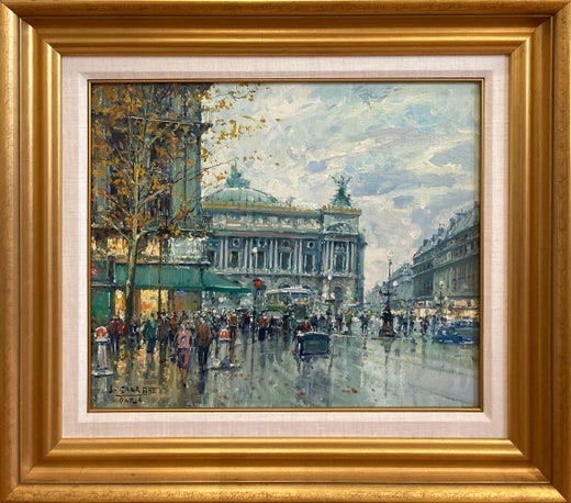 His paintings are a wonderful example of his dedication and passion throughout his of his career. Exemplary depictions of his pieces are city scenes of artist's vendors selling paintings along the view of Notre Dame de Paris, in Paris. People are scattered throughout between the tree-lined Parisian streets. Or like flower vendors walking down the street with a view from the Pont Neuf bridge, the oldest standing bridge crossing the river Seine, with people are scattered throughout with cars depicted in the background. As well wonderful examples of his works the street scenes with bustling cars and the traffic of the people walking along the sidewalks in front of the storefront view of Parisian cafe's as well as wonderful depictions of the most important Parisian monuments and iconic views of the city of Paris.