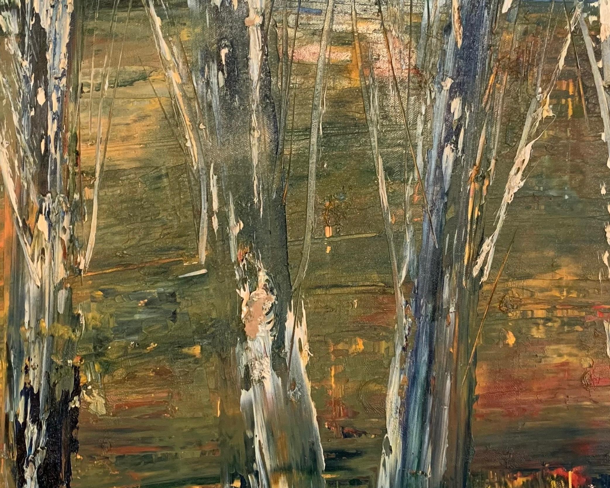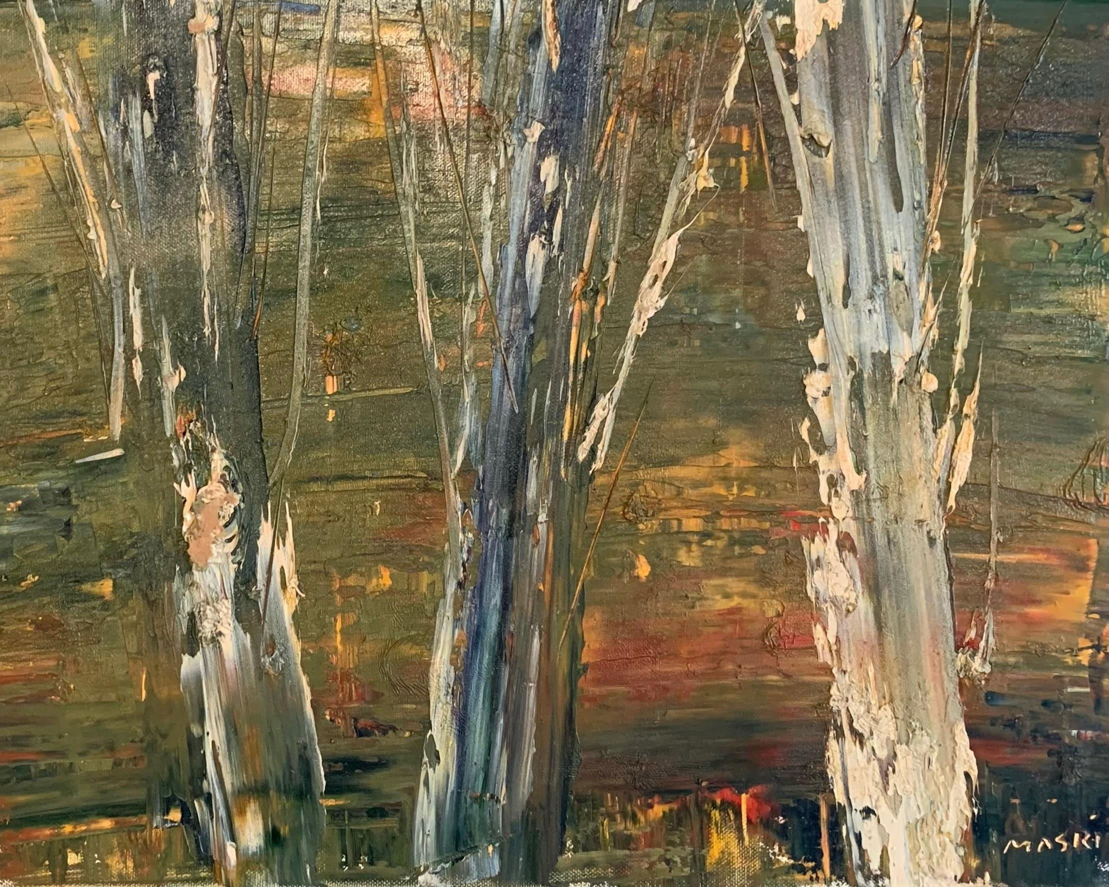 "Autumn's End" is a compelling perspective landscape by Masri that beautifully marries post-impressionist art with the subtle intimations of an expressionist at the cusp of fall. The canvas is a textured tableau, with a foreground dominated by slender vertical forms that evoke the raw beauty of tree trunks. The artist's palette is an earthy mosaic of greens, browns, and hints of autumnal oranges and reds that seem to glow with an inner fire against the subdued background. The painting's style is an engaging mix of realism and abstraction. The trunks, with their peeling bark and rugged surfaces, offer a stark, detailed contrast to the soft, brushy expanse that suggests a distant vista. The eye is drawn through the trees to a horizon that is felt more than seen, a testament to Masri's skill in evoking emotion through color and form.