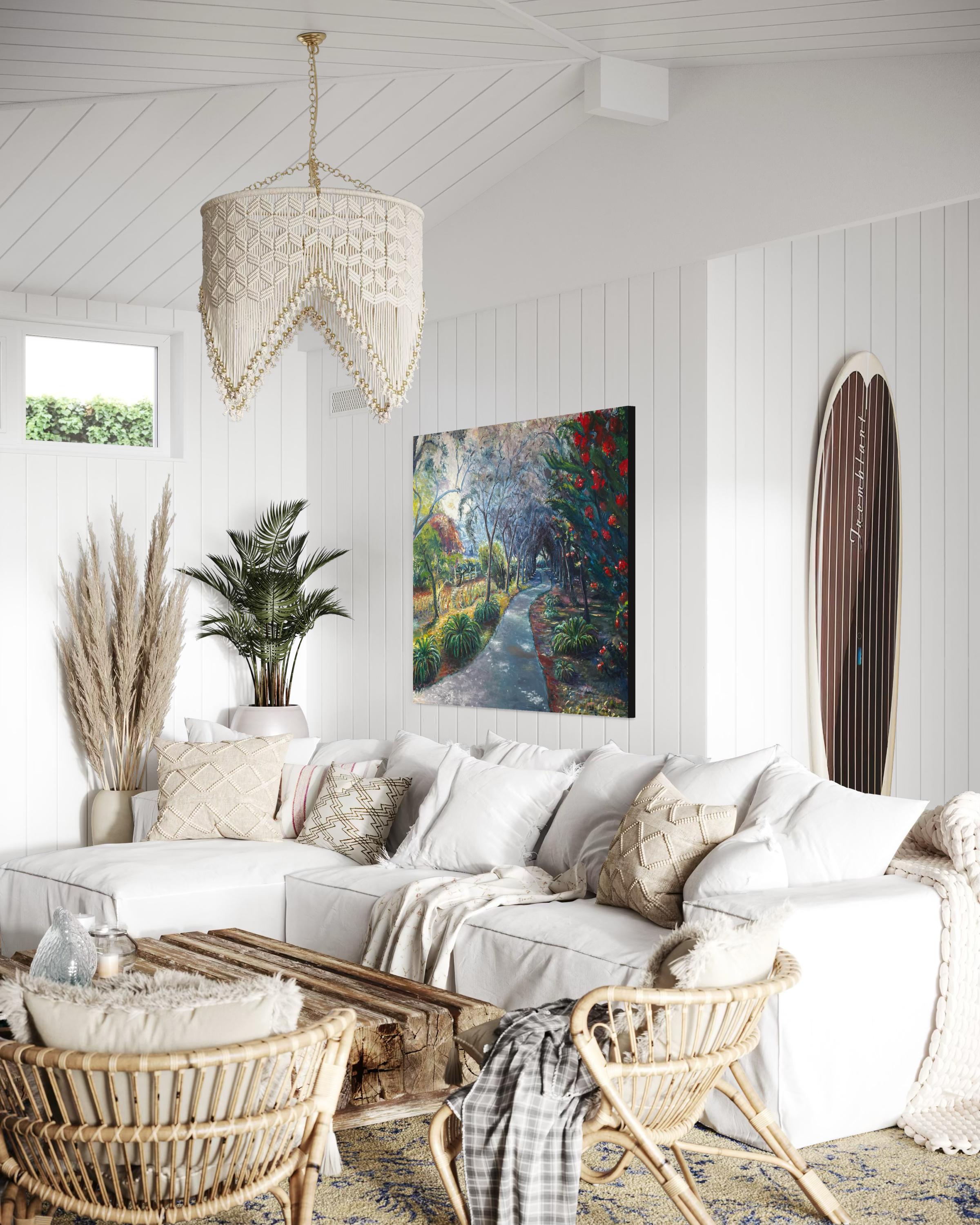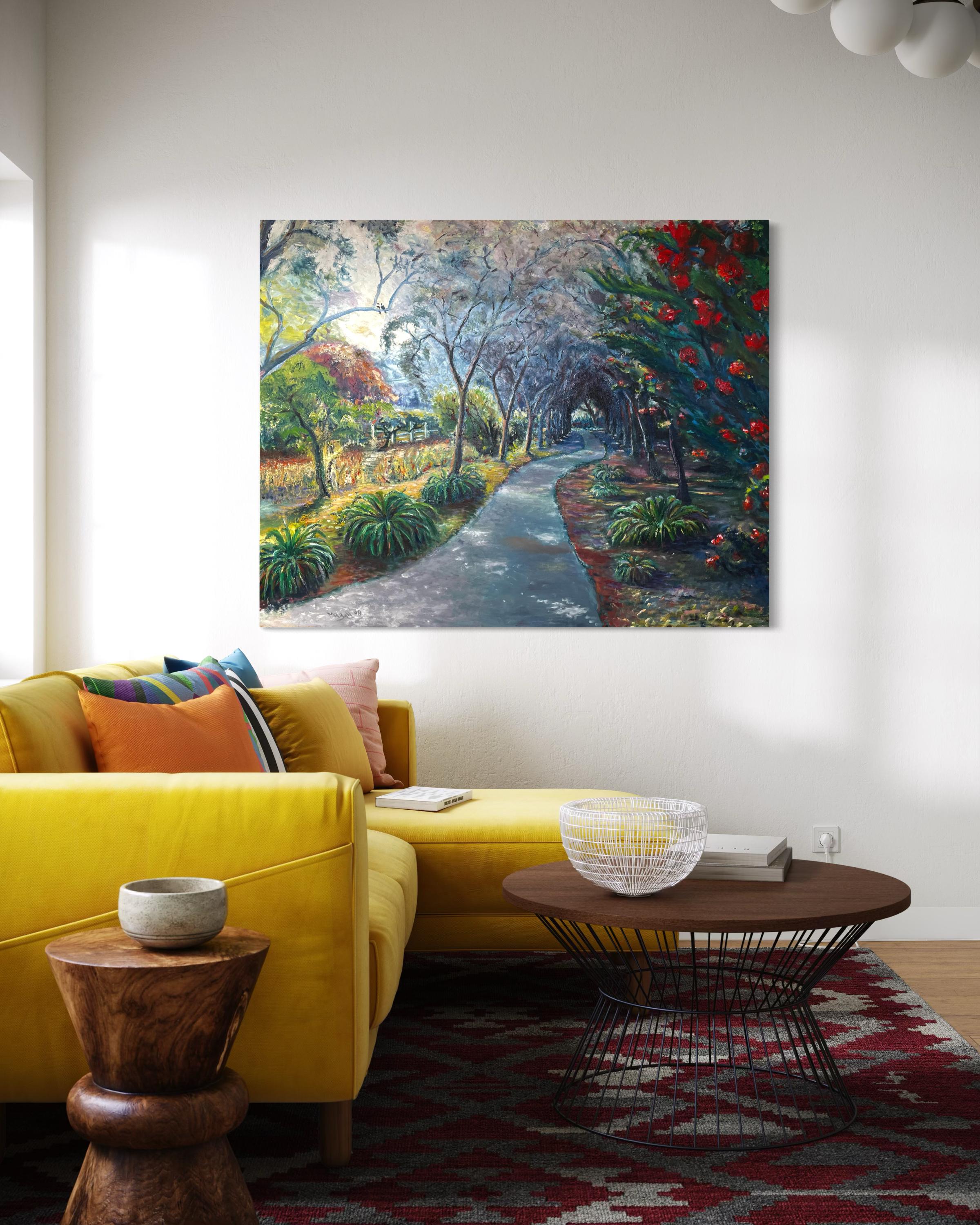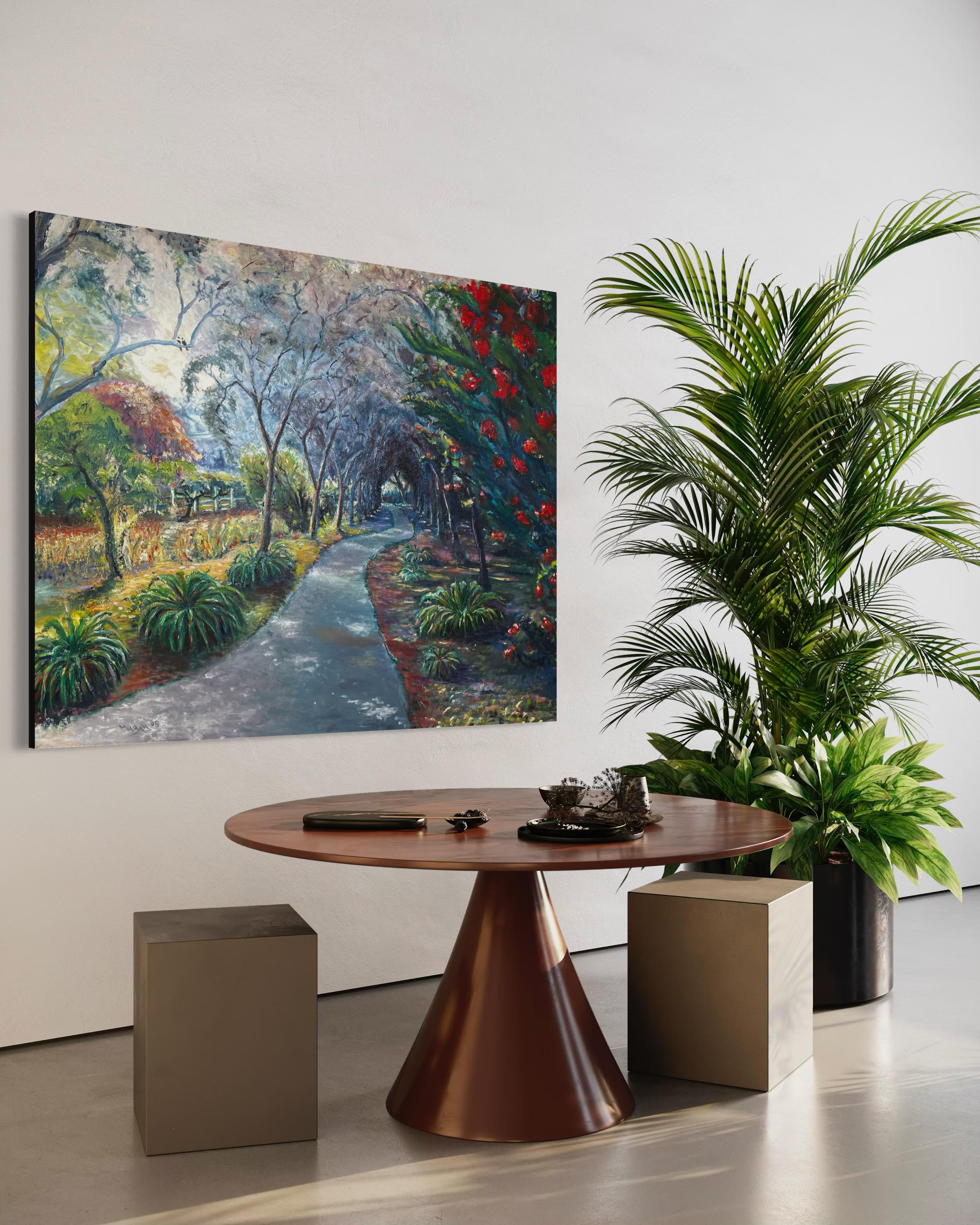 "The Curvy Path" by Mike Ball captures the serene beauty of a garden walkway. This contemporary landscape is painted with a harmonious palette of greens, reds, and earth tones, contrasting with the soft greys and blues of the sky. Ball’s application of color is vibrant and abundant, bringing to life the lush foliage and blooming flowers that border the meandering path. The composition leads the eye through the twists and turns of the journey, inviting contemplation of the road ahead. The dappled light filtering through the trees adds a sense of tranquility and hope. This piece conveys a peaceful, reflective moment, encouraging the viewer to take in the simple beauty of nature’s course.