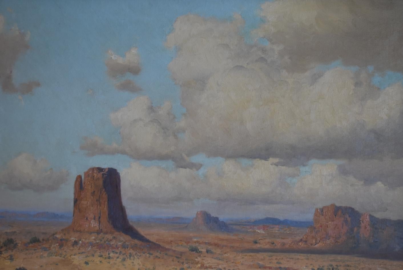 Large American impressionist landscape painting of Monument Valley. Oil on canvas. Apparently unsigned. Nicely framed. Image size, 36L x 30H.